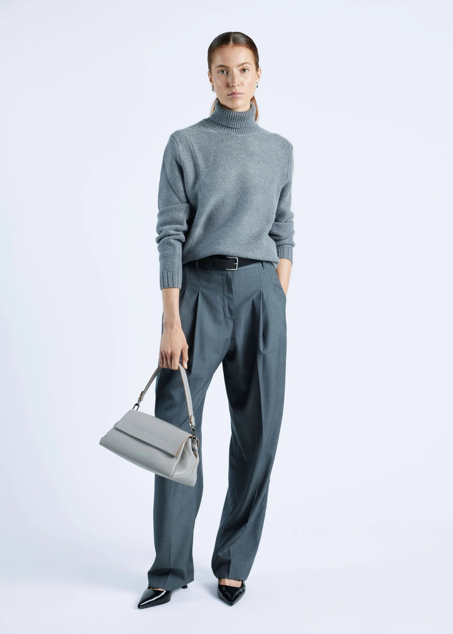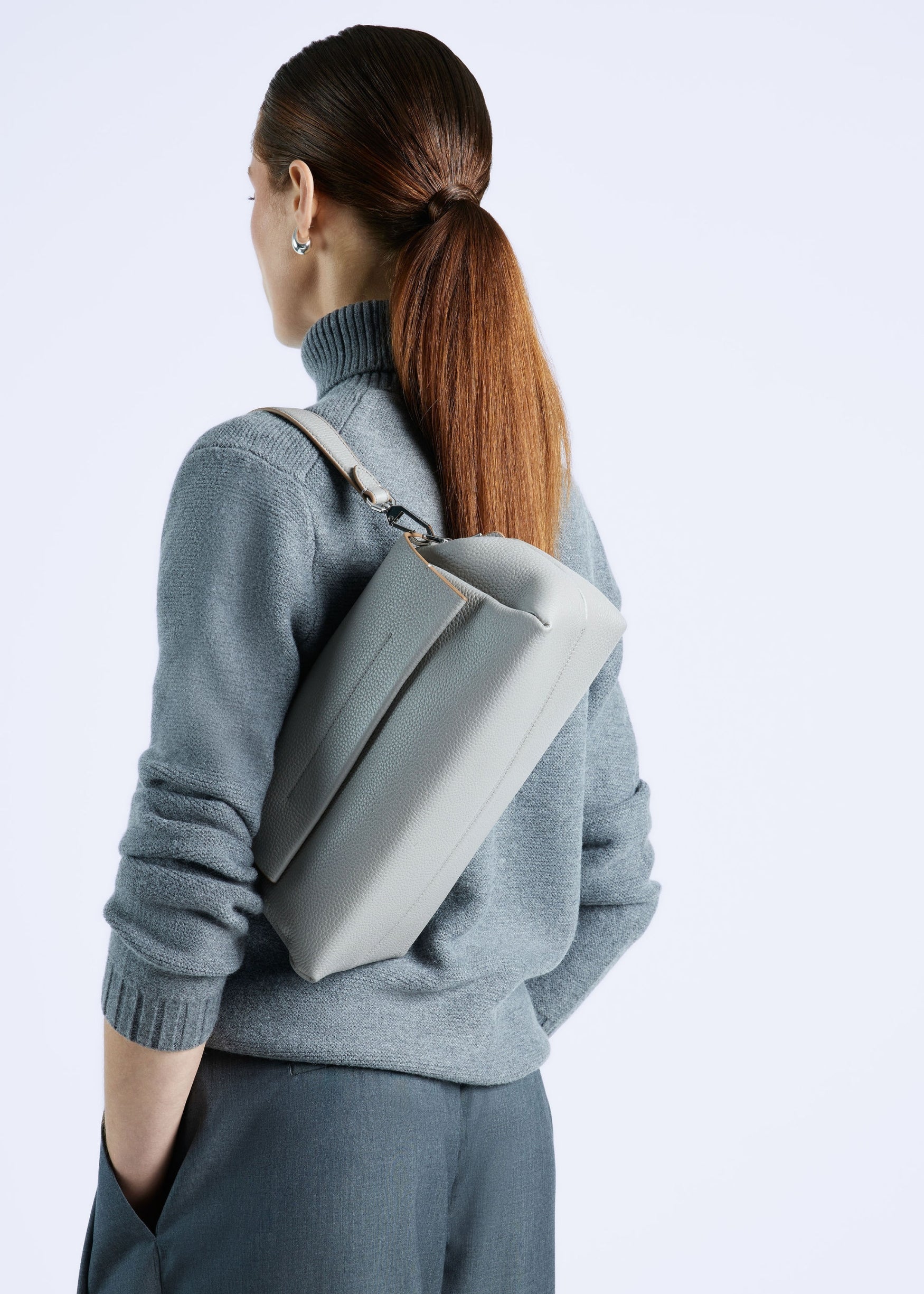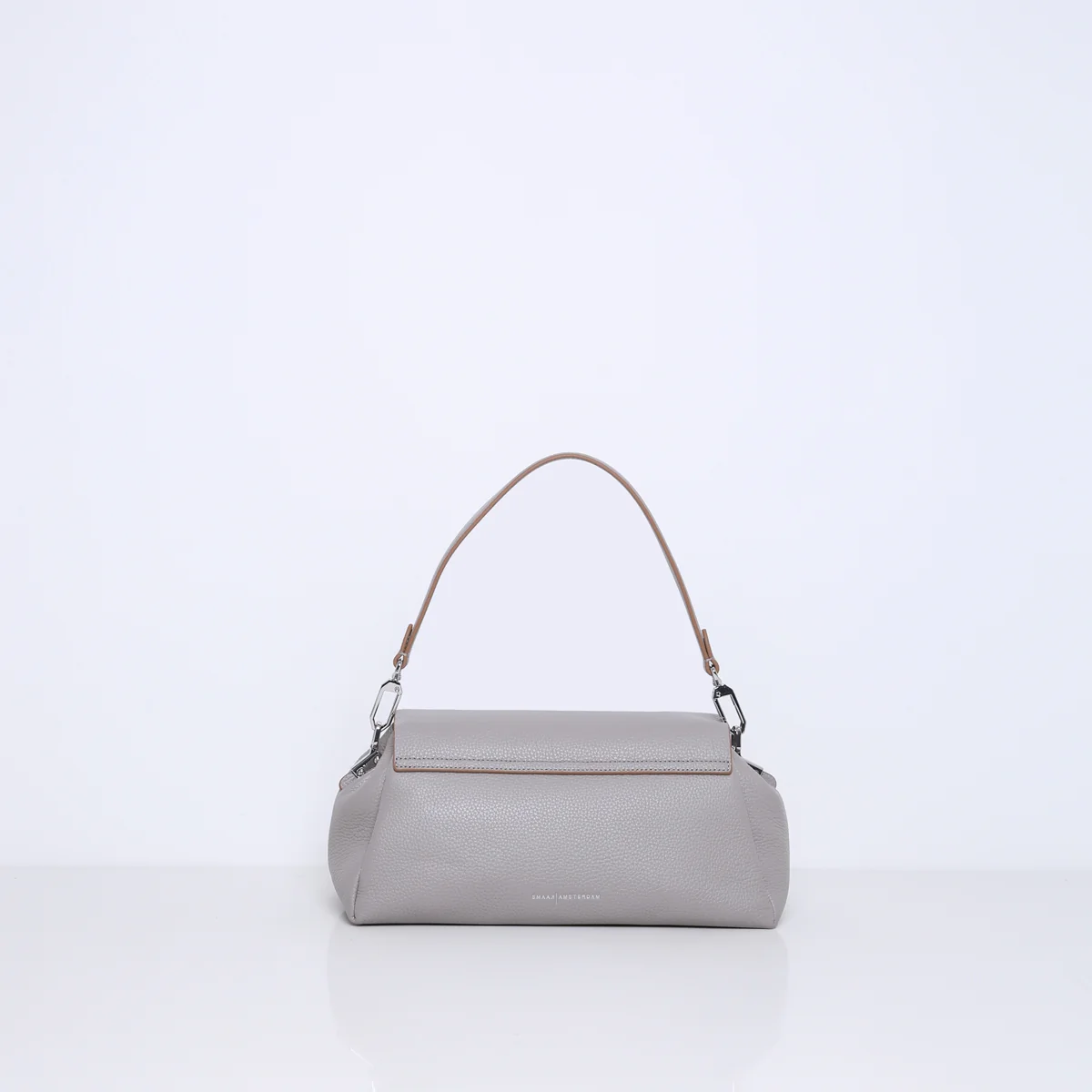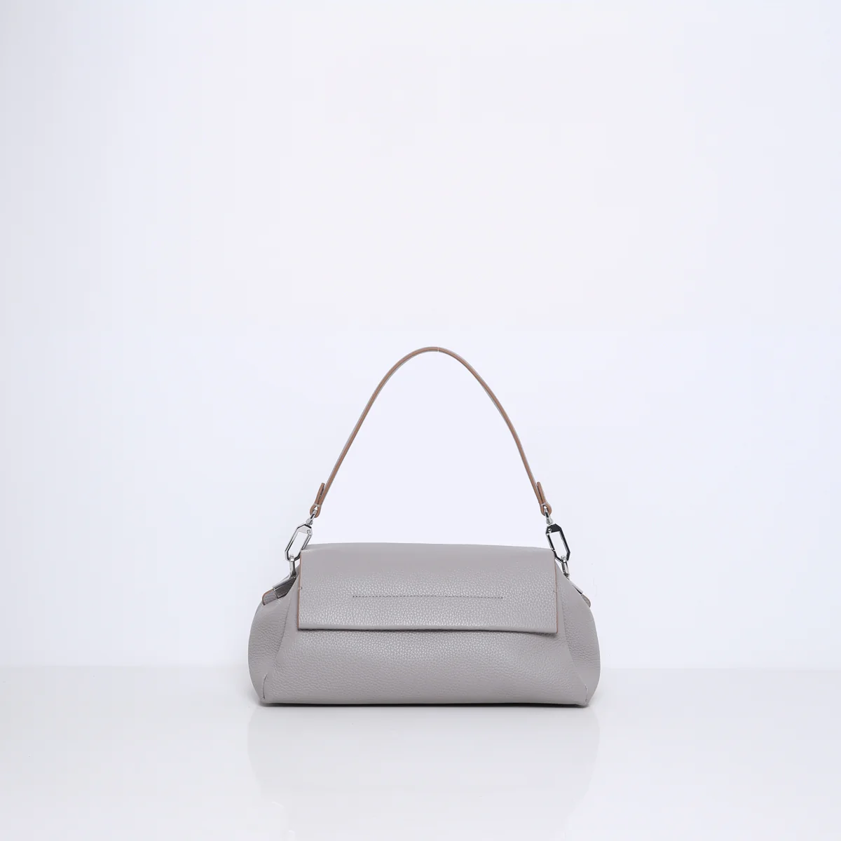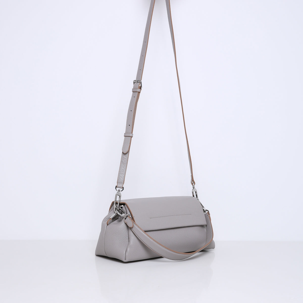 Die Tasche hat zwei abnehmbare Griffe, einen kurzen Schulterriemen und einen langen, längenverstellbaren Querriemen. Die Tasche ist aus weichem und geschmeidigem Rindsleder gefertigt und mit Veloursleder (Viskose) gefüttert.