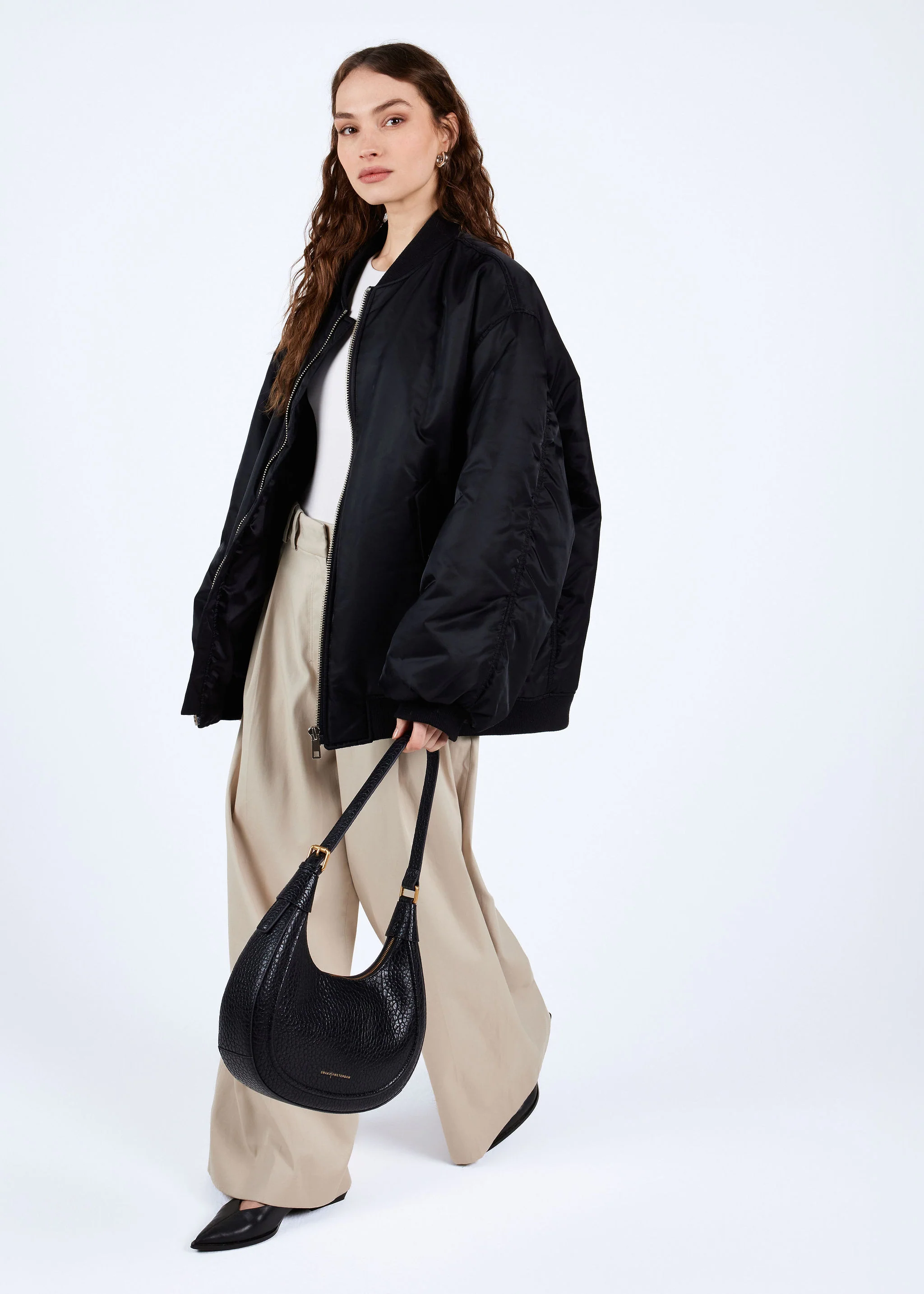 Die Tasche ist aus robustem Rindsleder mit einem Elefantenhaut-Reliefmuster gefertigt. Sie verfügt über einen Reißverschluss an der Oberseite und eine einzigartige Vorrichtung zum Verstellen der Länge des Riemens. Um den Gurt zu verstellen, müssen Sie das daran befestigte Teil an der Schnalle der Tasche befestigen oder abnehmen. Die Tasche verfügt über mehrere Innentaschen und ist mit Viskosematerial gefüttert.