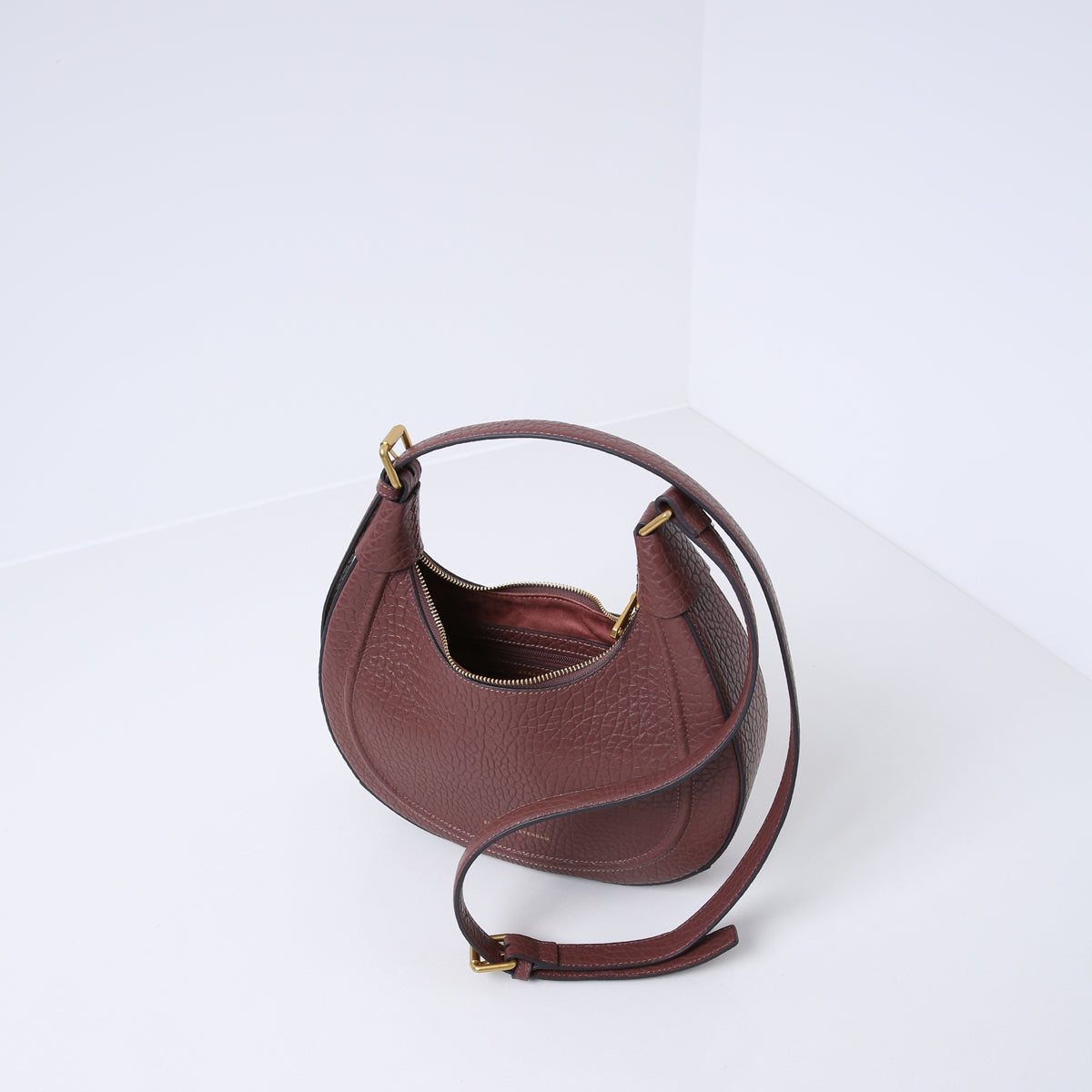 Die Tasche ist aus robustem Rindsleder mit einem Elefantenhaut-Reliefmuster gefertigt. Sie verfügt über einen Reißverschluss an der Oberseite und eine einzigartige Vorrichtung zum Verstellen der Länge des Riemens. Um den Gurt zu verstellen, müssen Sie das daran befestigte Teil an der Schnalle der Tasche befestigen oder abnehmen. Die Tasche verfügt über mehrere Innentaschen und ist mit Viskosematerial gefüttert.