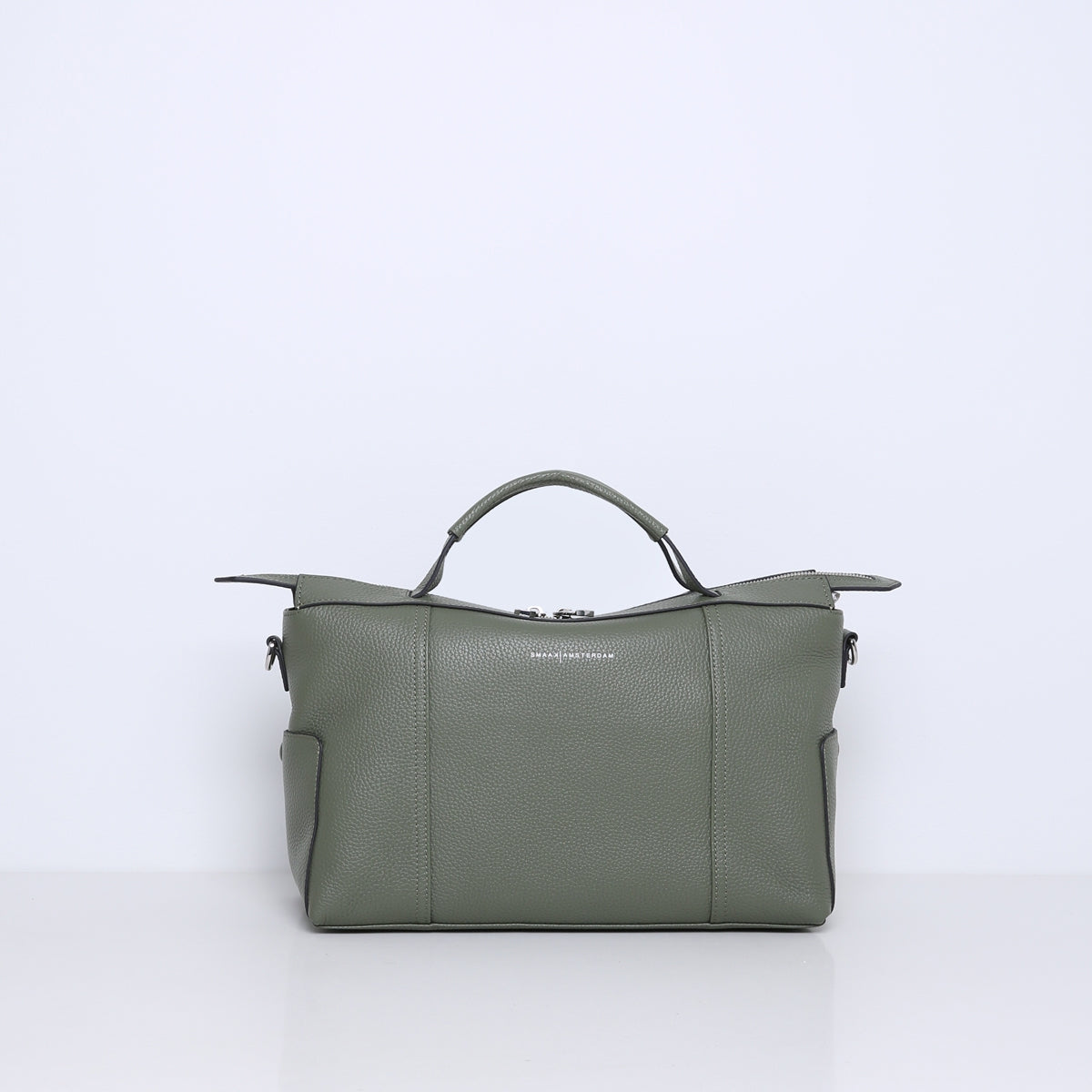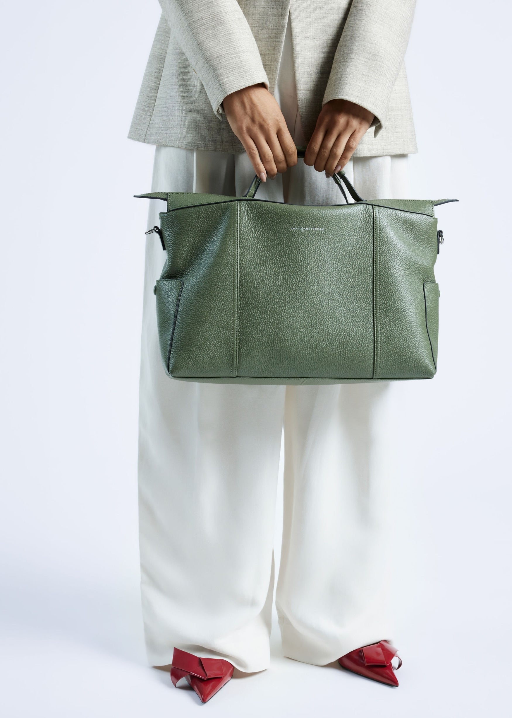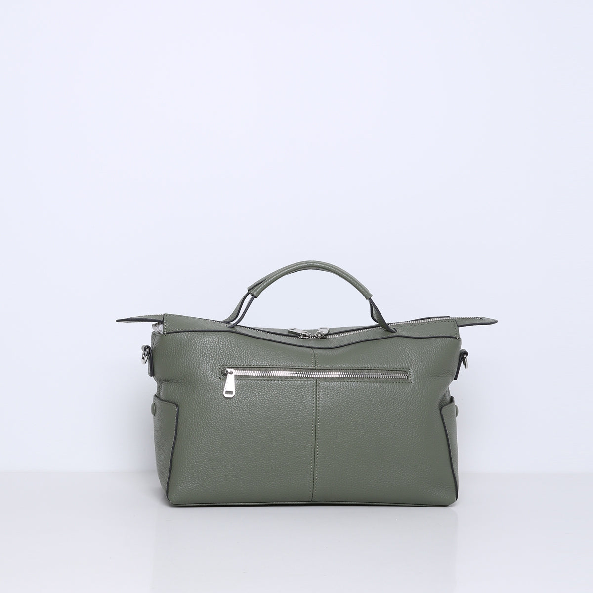 Die Tasche ist aus weichem, geschmeidigem Rindsleder gefertigt und wird oben mit einem Reißverschluss geschlossen.
