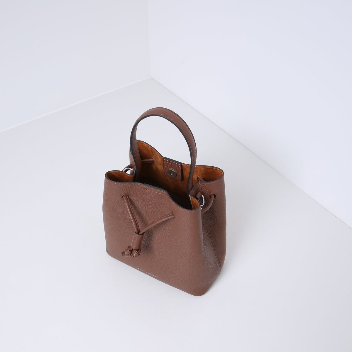 Mit geknotetem Kordelzug an der Oberseite und Magnetverschluss an der Innenseite. Sie verfügt über ein zusätzliches, herausnehmbares Fach und ist mit Veloursleder (Viskose) gefüttert.
