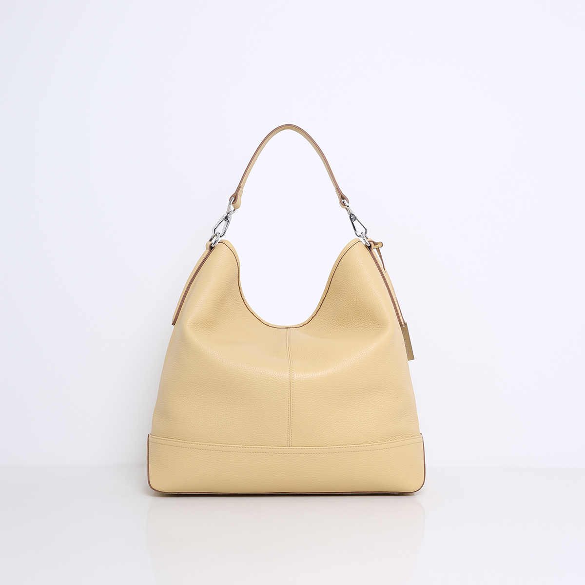 Es handelt sich um eine klassische Hobo-Bag, die üblicherweise über der Schulter getragen wird, mit einem einzigen breiten Riemen, der bequem auf der Schulter ruht.