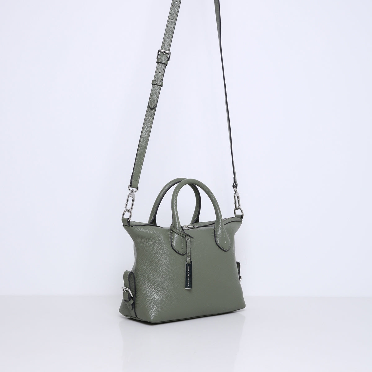Die Tasche verfügt über ein zusätzliches Reißverschlussfach auf der Rückseite und wird oben komplett mit einem Reißverschluss geschlossen. Einzigartige Details an diesem Modell sind die Schnallen an den Seiten, die Sie öffnen oder schließen können, um zusätzlichen Platz und ein verspieltes Design zu schaffen.