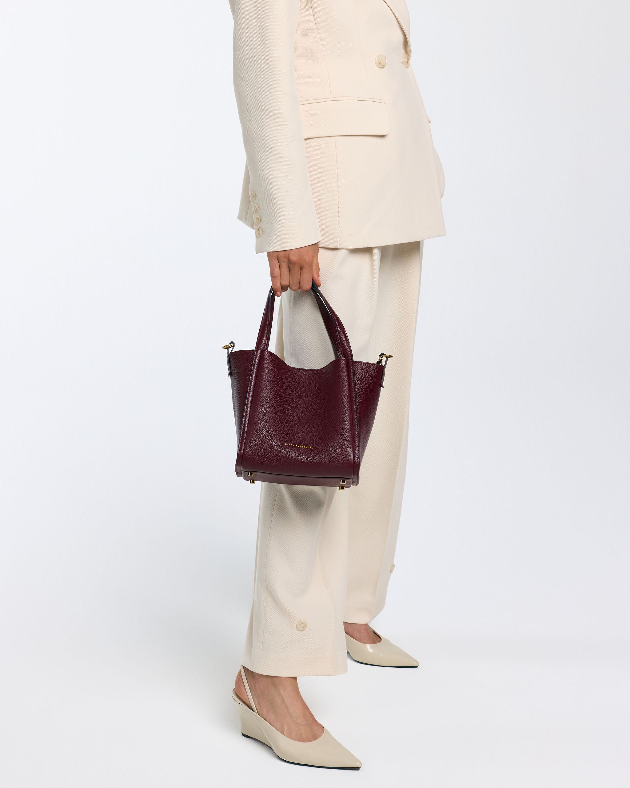 Was die JANE auszeichnet, ist ihr ausgeklügeltes Design und ihre Vielseitigkeit, so dass sie überall eingesetzt werden kann. Die Ledergriffe verlaufen rund um das Design der Tasche. An der Oberseite befindet sich ein zusätzlicher Haken, mit dem man sie horizontal verbinden kann, um das Modell kompakter zu machen und seine Form zu verändern. Es erinnert daher an den Umriss einer Tulpe, einer Blume, die oft mit Schönheit und Anmut assoziiert wird.