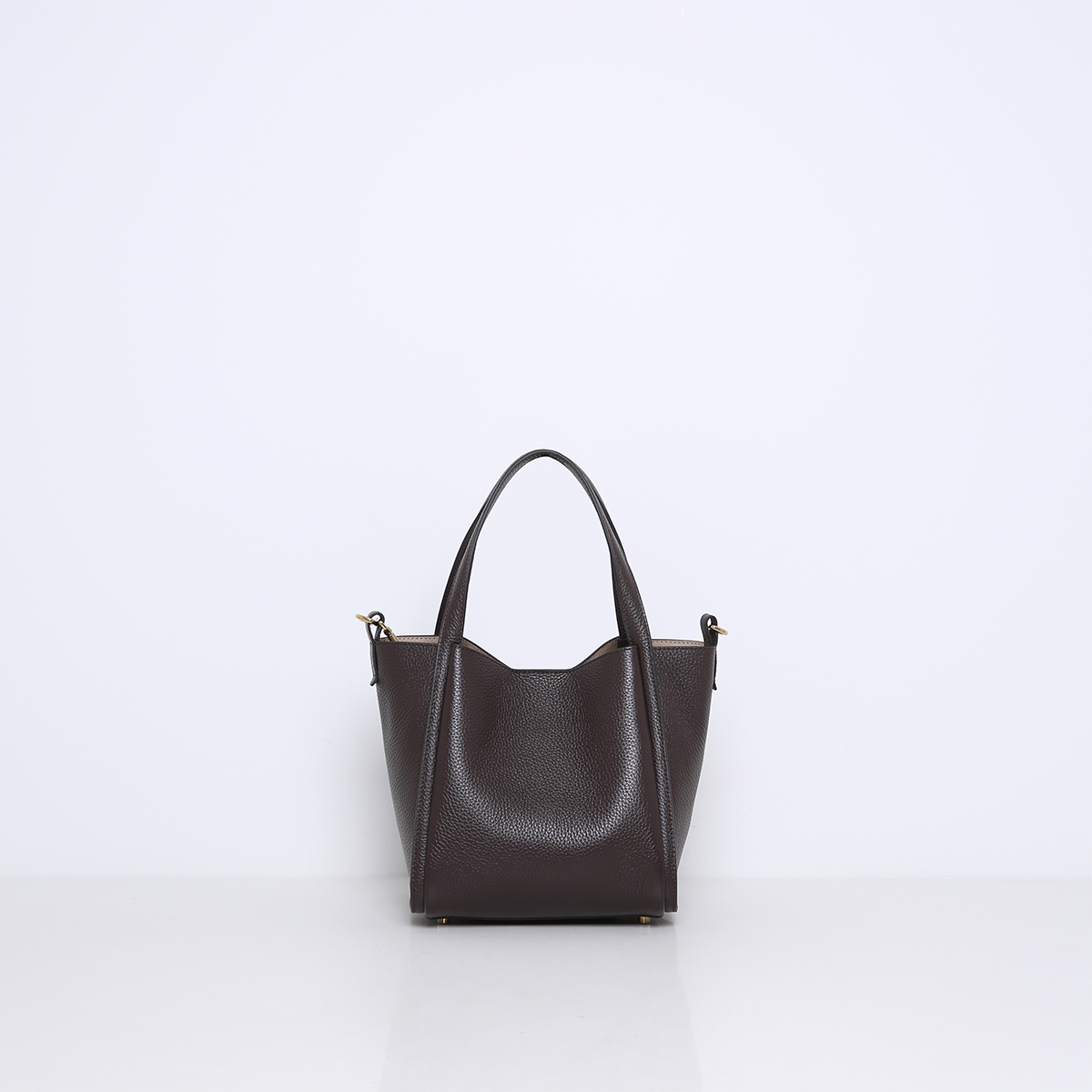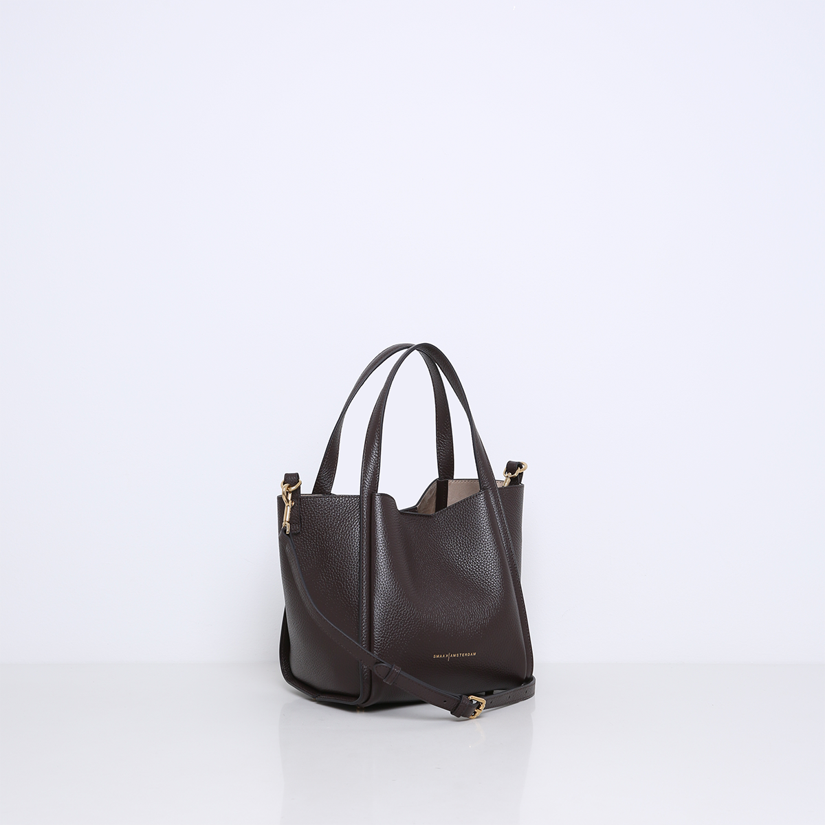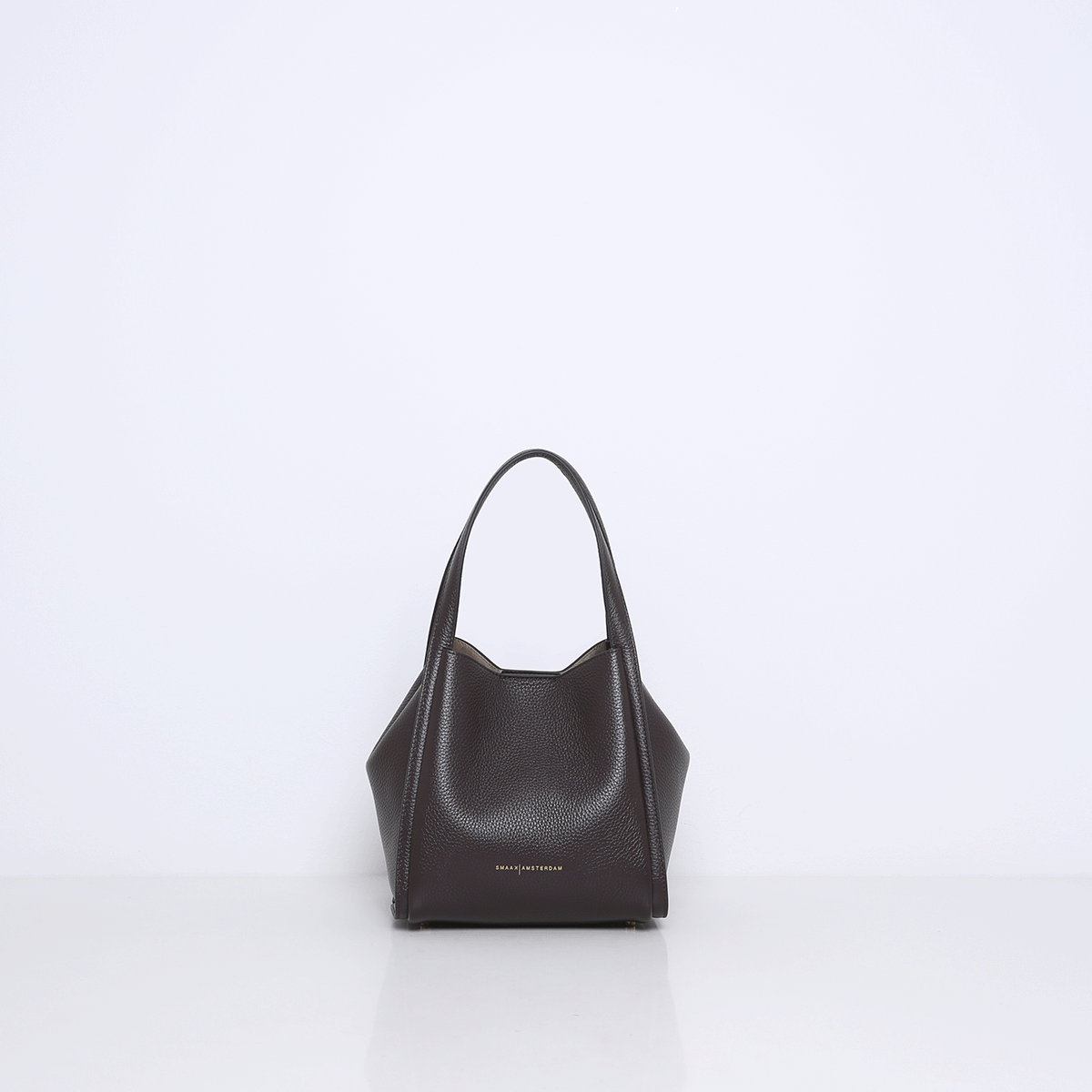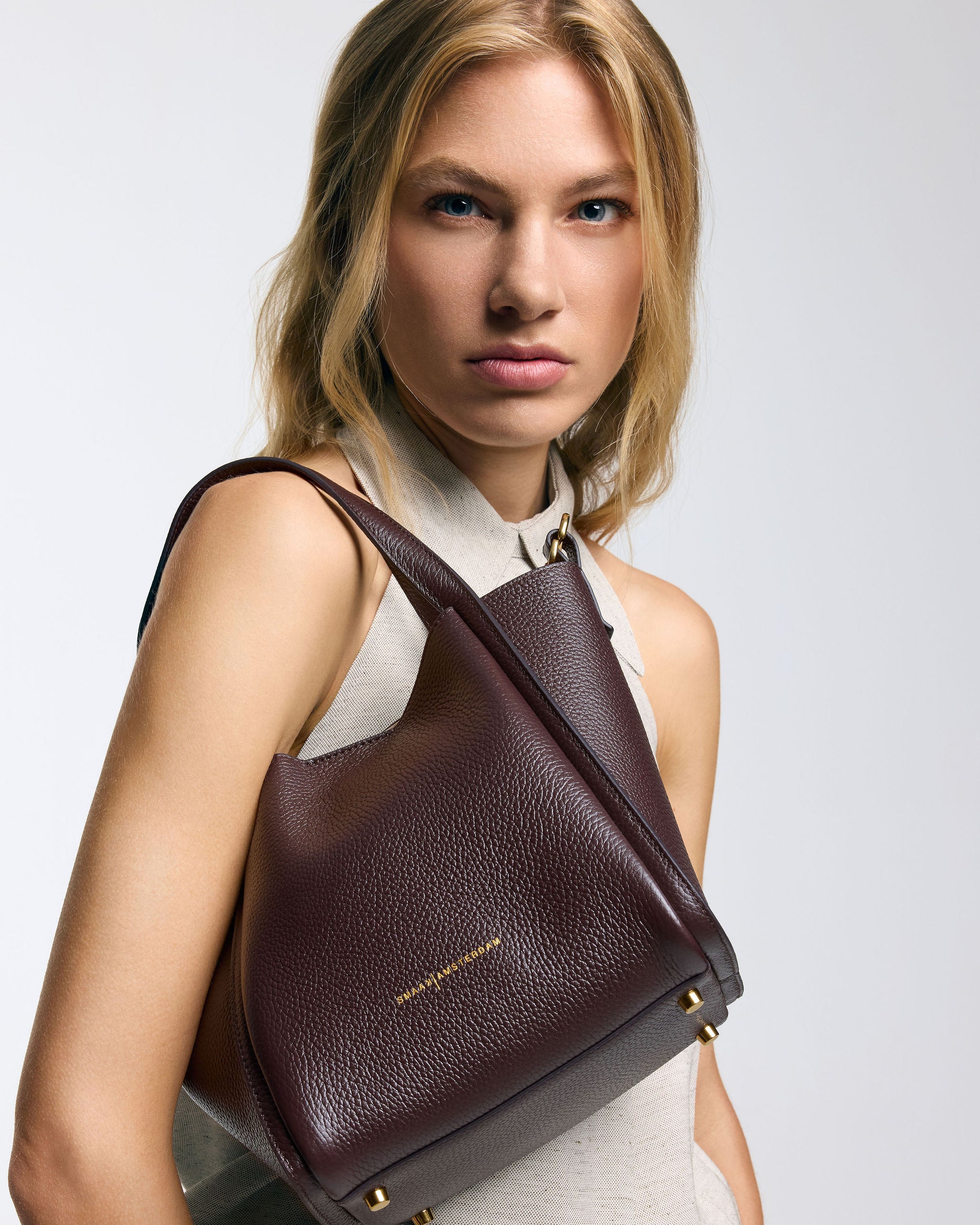 Was die JANE auszeichnet, ist ihr ausgeklügeltes Design und ihre Vielseitigkeit, so dass sie überall eingesetzt werden kann. Die Ledergriffe verlaufen rund um das Design der Tasche. An der Oberseite befindet sich ein zusätzlicher Haken, mit dem man sie horizontal verbinden kann, um das Modell kompakter zu machen und seine Form zu verändern. Es erinnert daher an den Umriss einer Tulpe, einer Blume, die oft mit Schönheit und Anmut assoziiert wird.