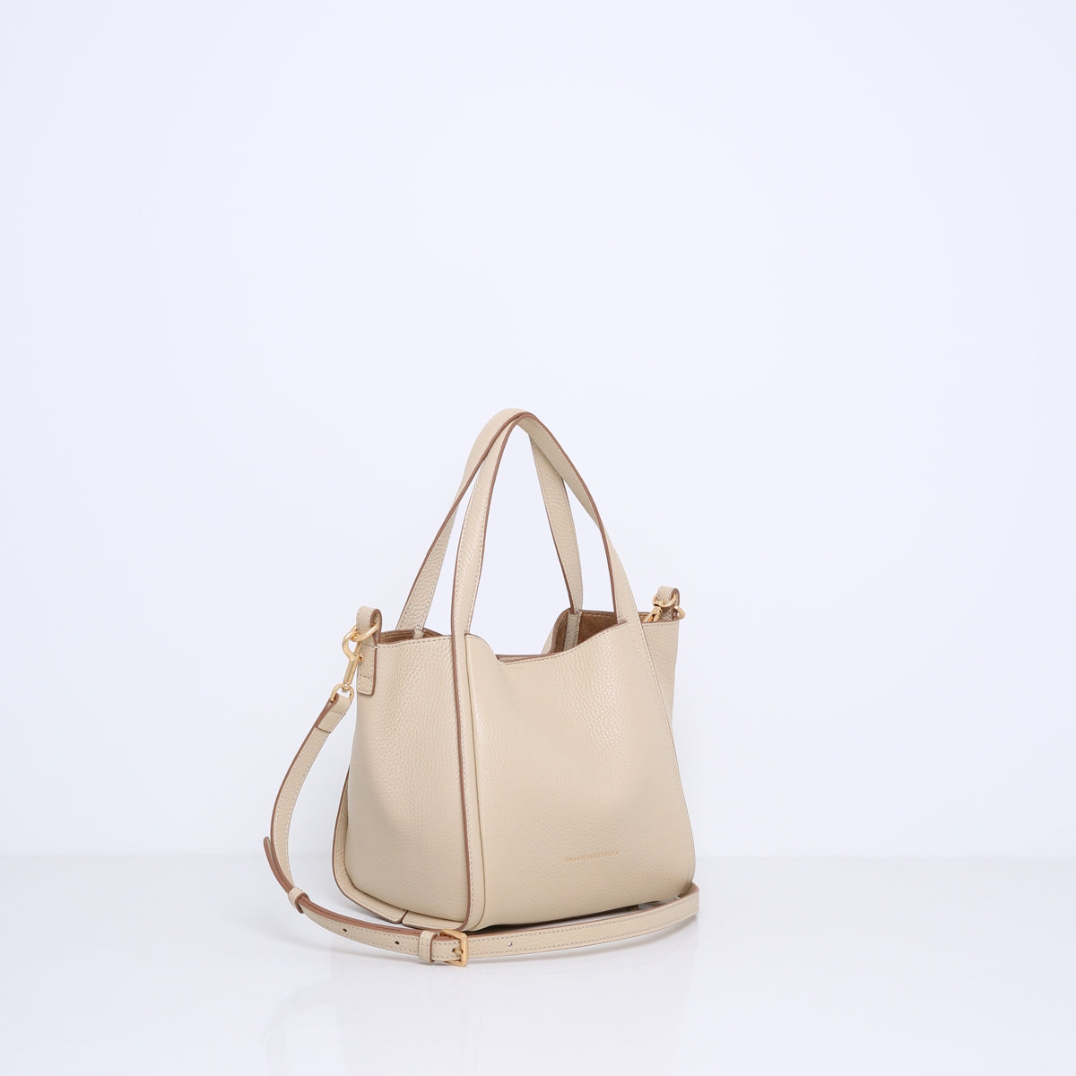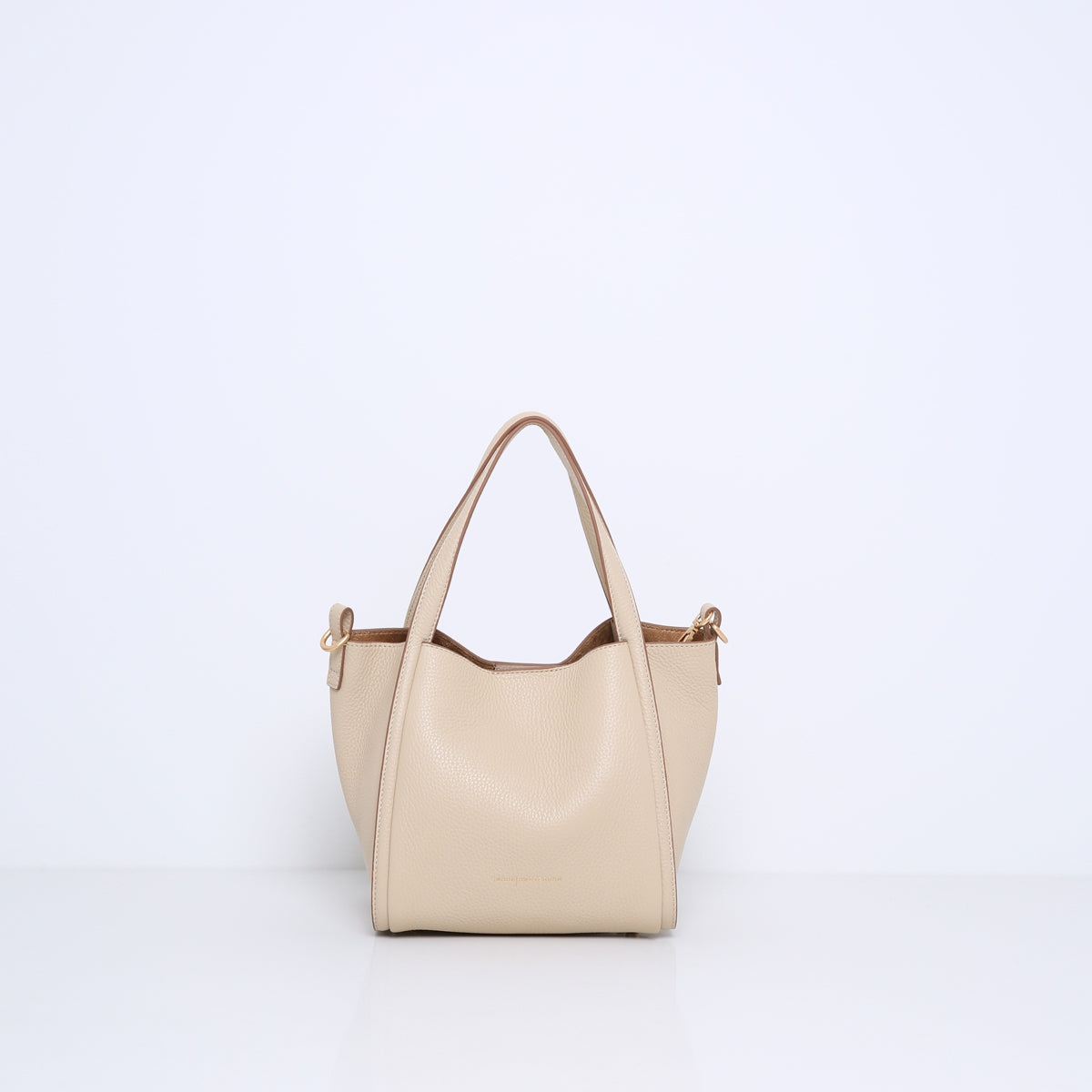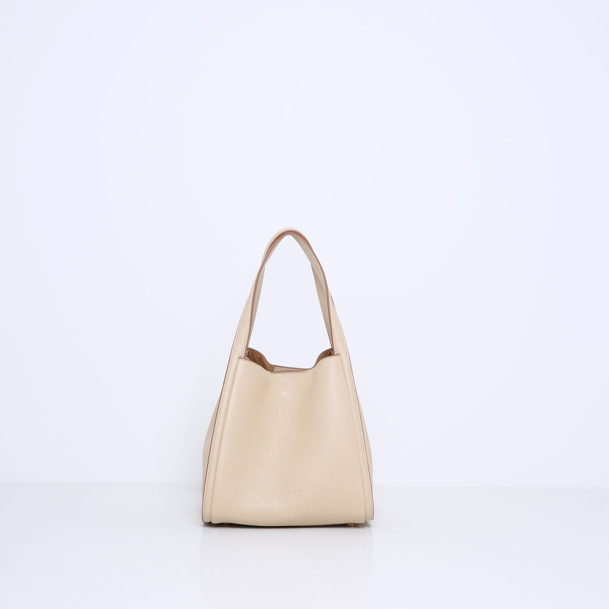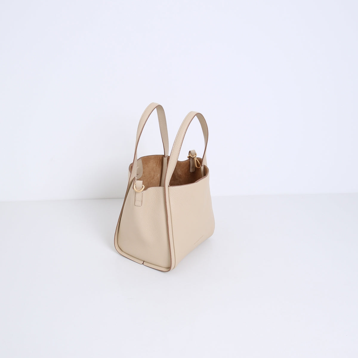 Was die JANE auszeichnet, ist ihr ausgeklügeltes Design und ihre Vielseitigkeit, so dass sie überall eingesetzt werden kann. Die Ledergriffe verlaufen rund um das Design der Tasche. An der Oberseite befindet sich ein zusätzlicher Haken, mit dem man sie horizontal verbinden kann, um das Modell kompakter zu machen und seine Form zu verändern. Es erinnert daher an den Umriss einer Tulpe, einer Blume, die oft mit Schönheit und Anmut assoziiert wird.