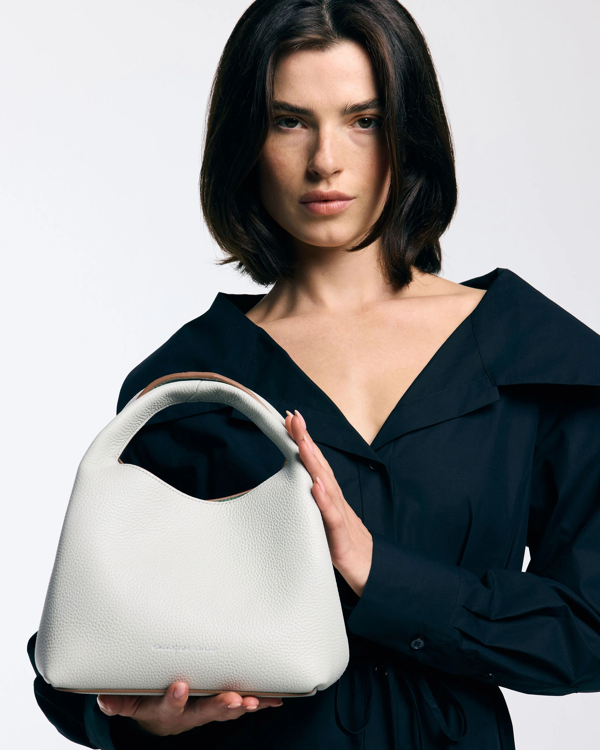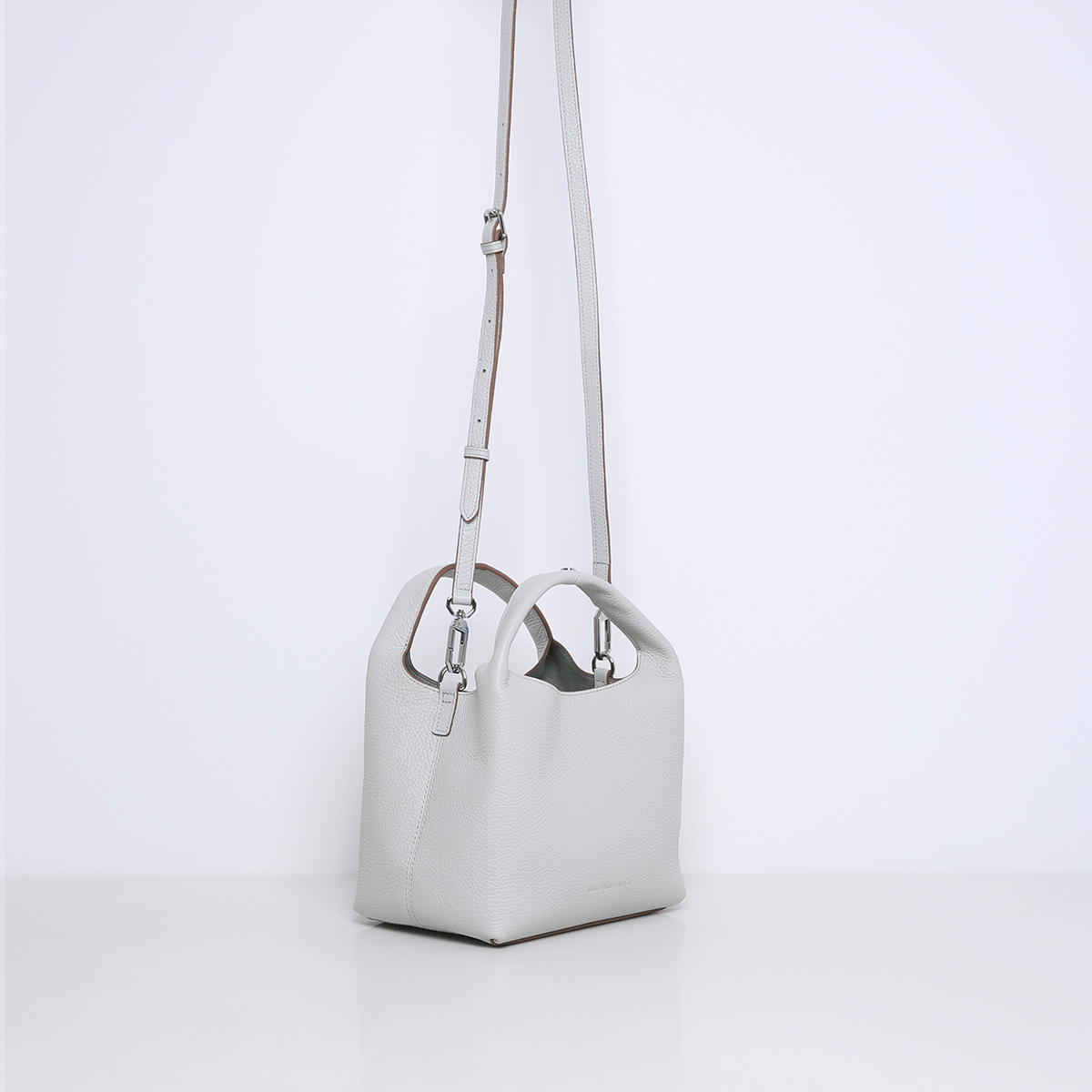 Die silberfarbenen Details bilden einen raffinierten Kontrast zur Farbe des Leders und des Innenfutters, während die kompakte Größe Ihre wichtigsten Utensilien stilvoll zusammenhält. Tragen Sie die Tasche am Henkel für einen stilvollen Look oder crossbody für einen mühelos coolen Look.