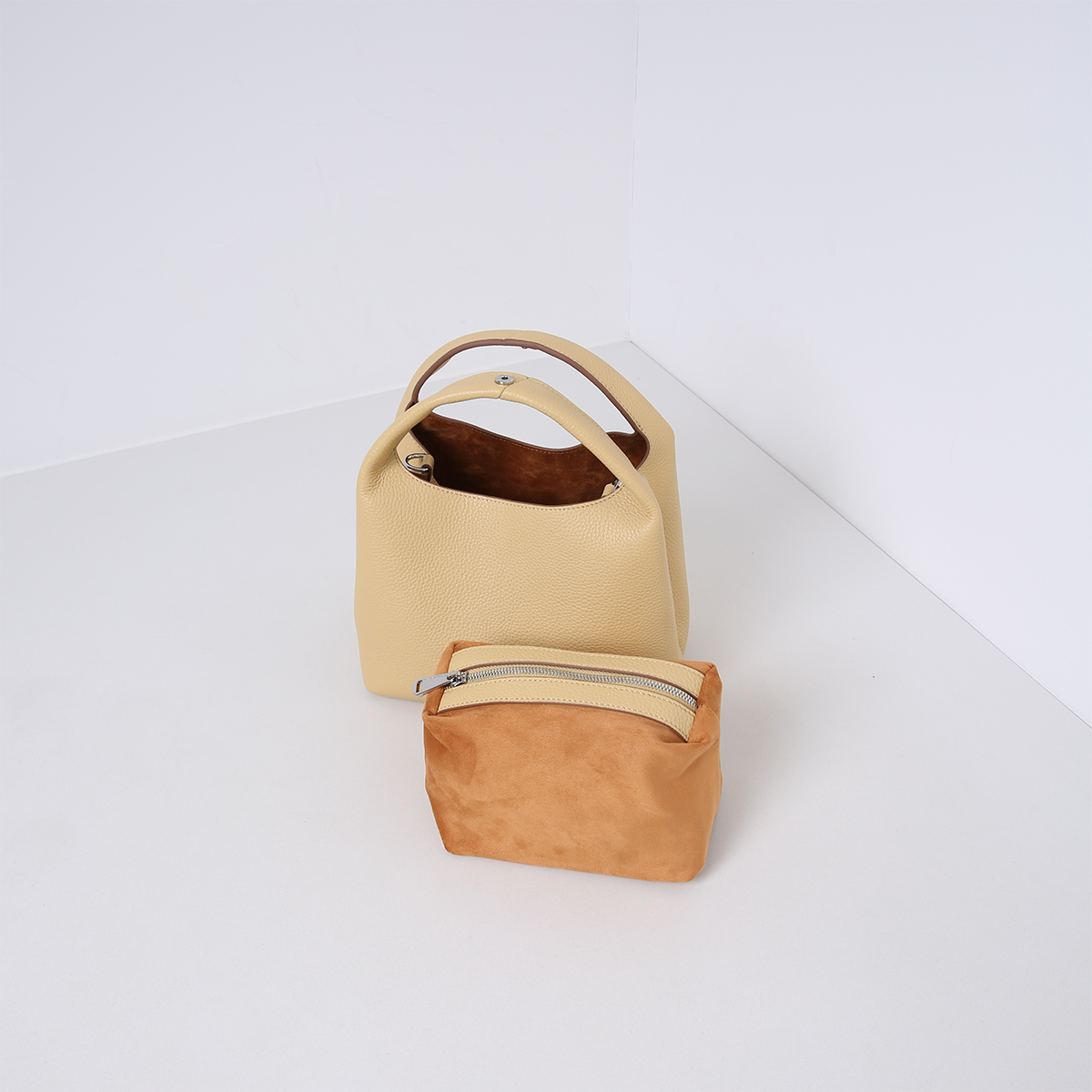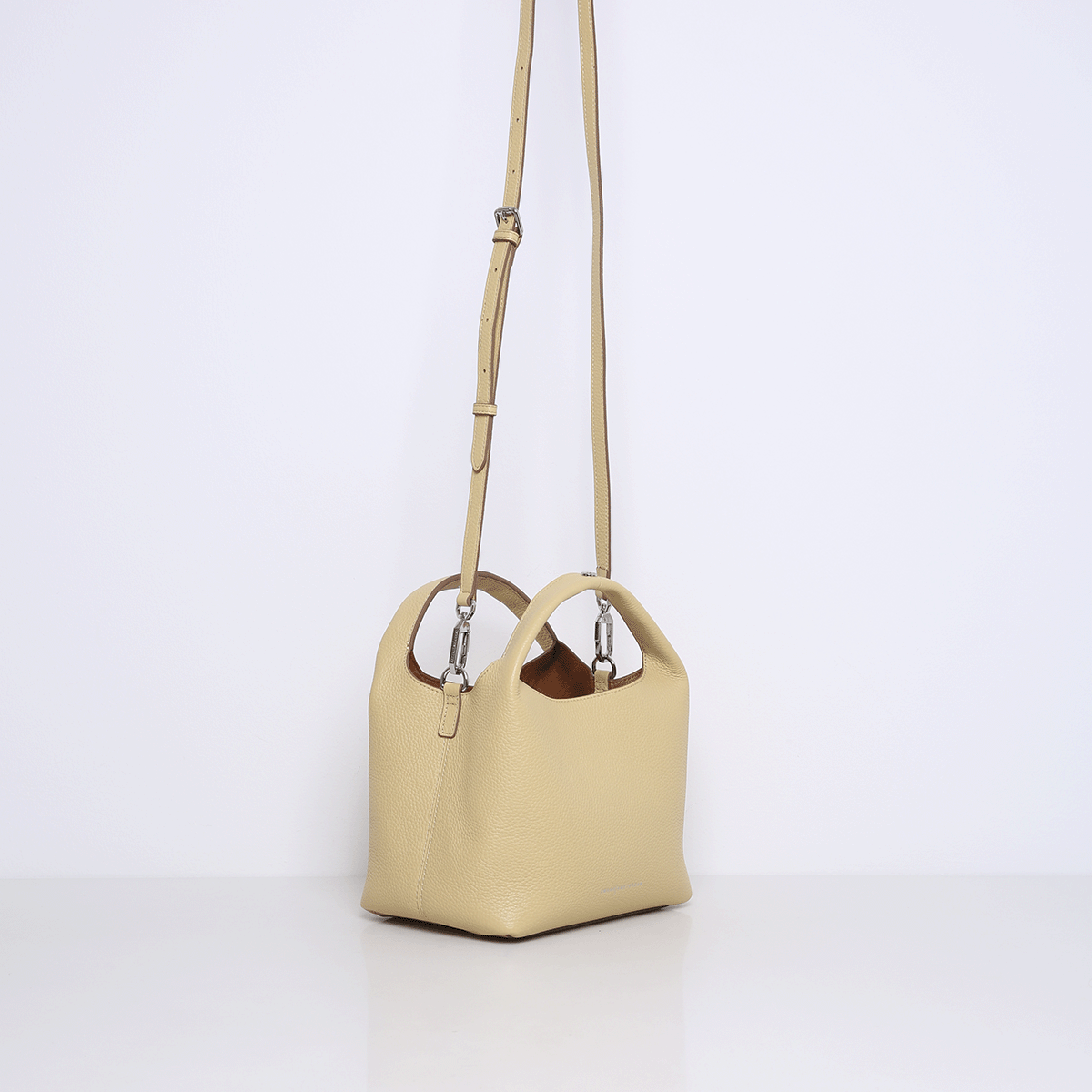 Die silberfarbenen Details bilden einen raffinierten Kontrast zur Farbe des Leders und des Innenfutters, während die kompakte Größe Ihre wichtigsten Utensilien stilvoll zusammenhält. Tragen Sie die Tasche am Henkel für einen stilvollen Look oder crossbody für einen mühelos coolen Look.