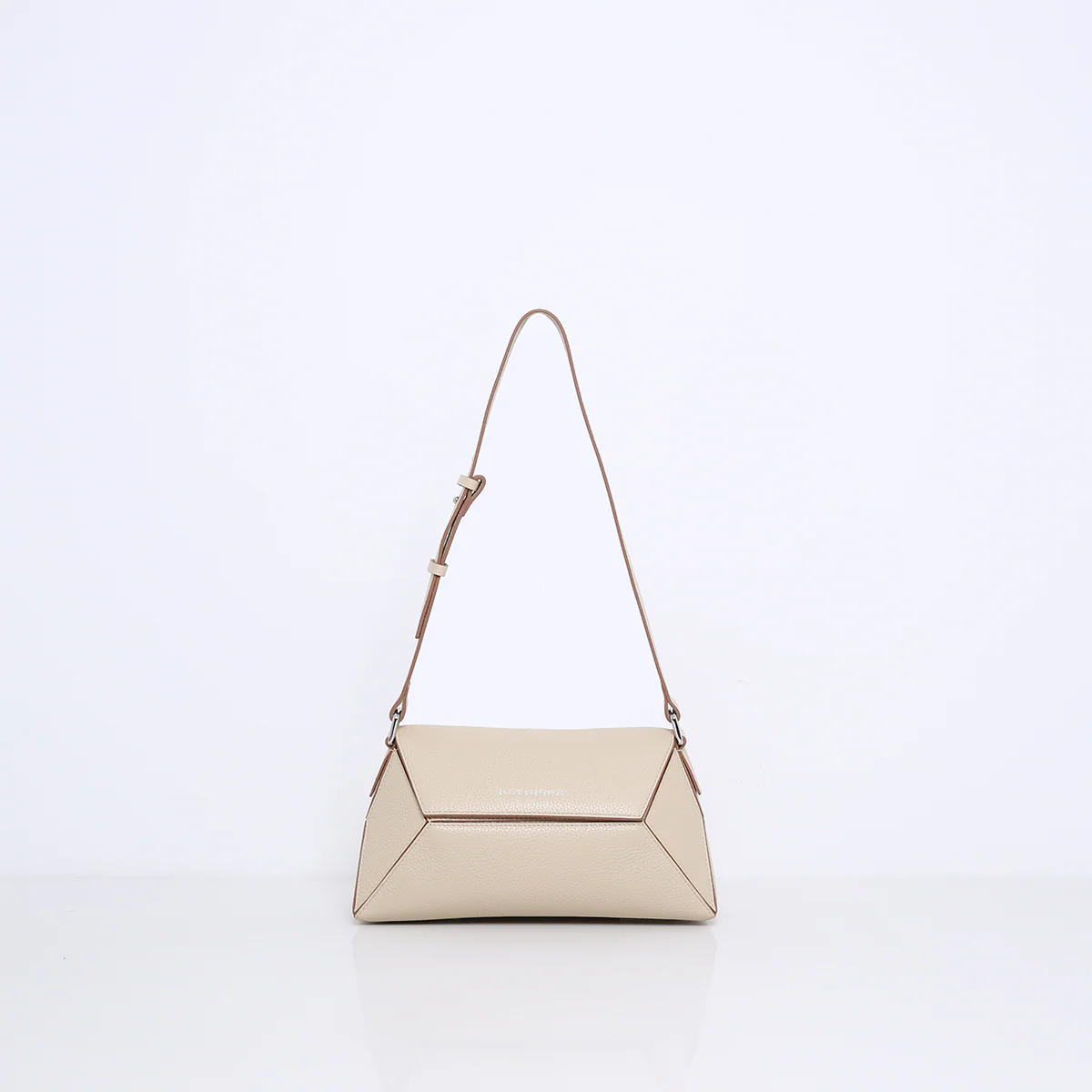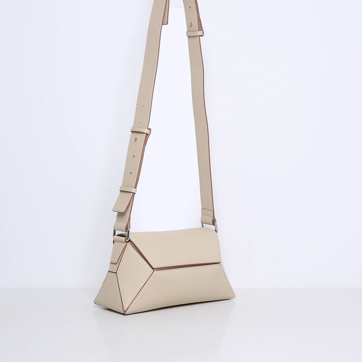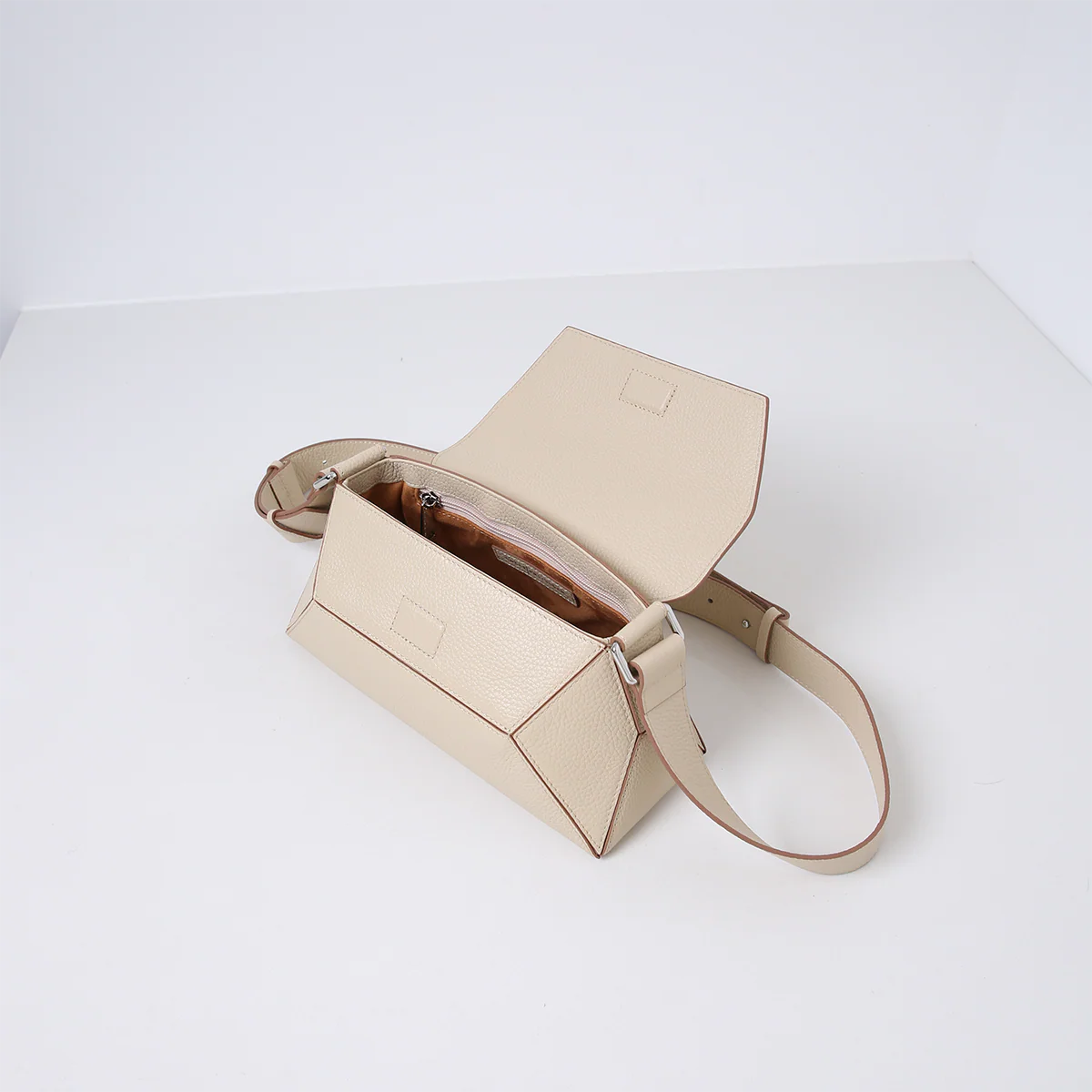 Das robuste, rechteckige Modell ist breit, aber kompakt genug, um es elegant zu tragen, egal ob man es sich über die Schulter hängt oder in der Hand hält. Die Linien im Leder verleihen der Tasche ein interessantes, puzzleartiges Aussehen, das dem Design eine moderne und anspruchsvolle Note verleiht. Der Deckel lässt sich mit einem unsichtbaren Magnetverschluss öffnen und sorgt so für ein elegantes und stromlinienförmiges Finish.