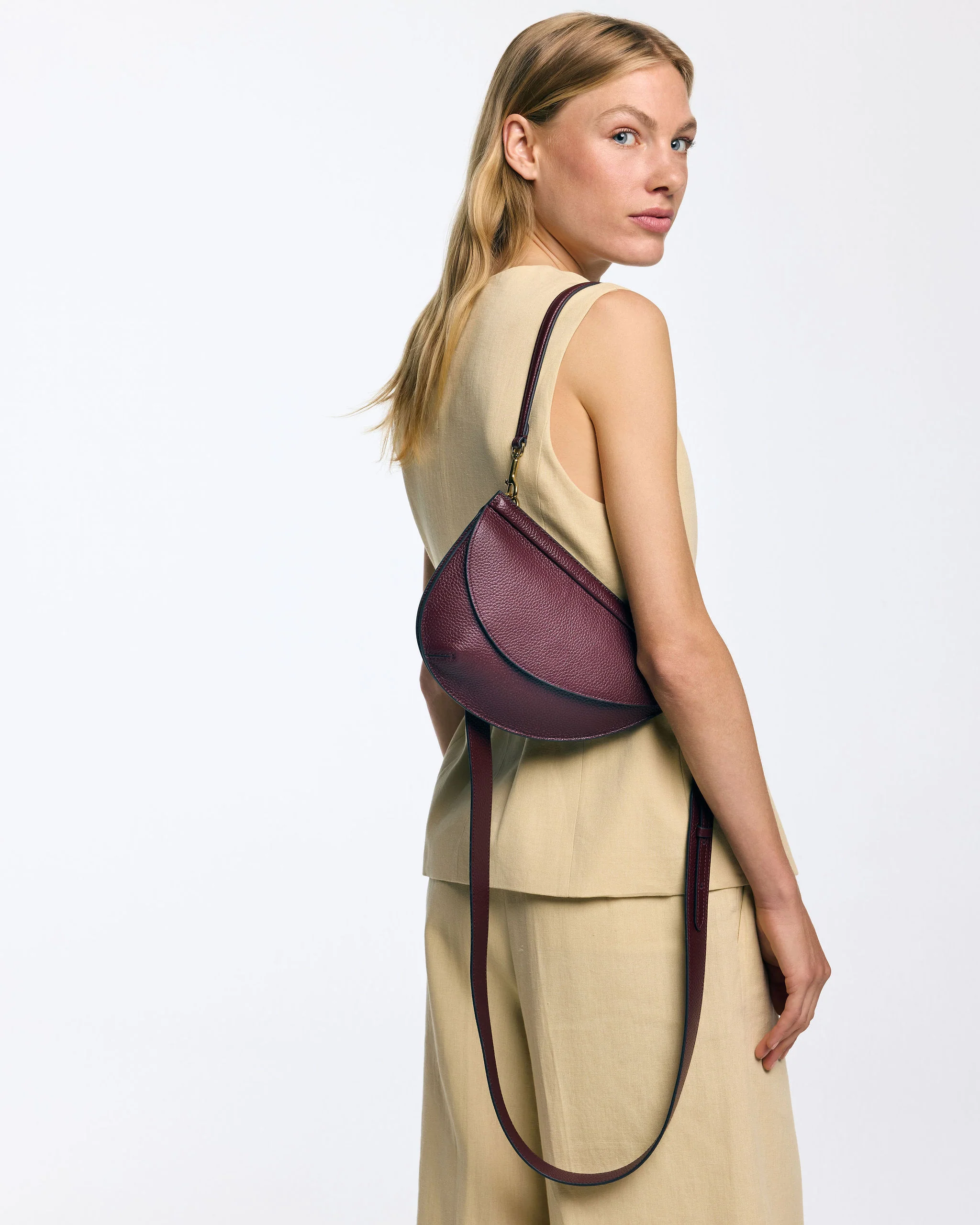 Die Tasche ist aus weichem, geschmeidigem Rindsleder gefertigt. Sie verfügt über mehrere offene Innenfächer und ist mit Veloursleder (Viskose) gefüttert. Der Verschluss ist mit einem Magneten im Leder versehen. Auf der Rückseite befindet sich eine zusätzliche Reißverschlusstasche. Sie hat einen kurzen Schulterriemen und einen langen, längenverstellbaren Querriemen.