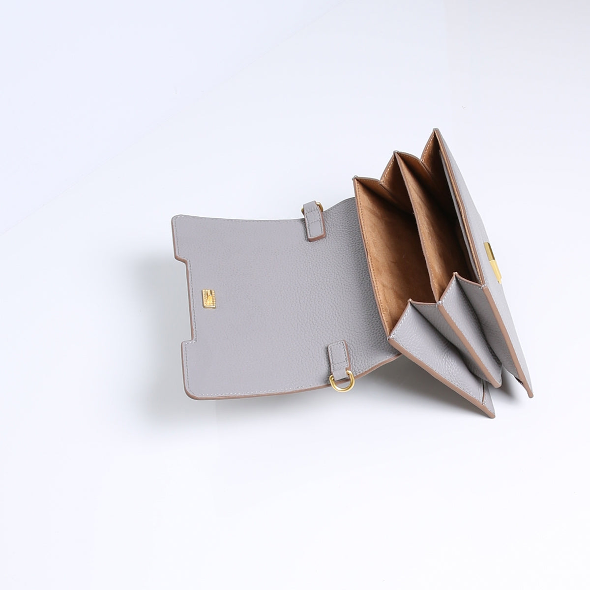 Das Design hat einen feinen Griff und schöne Details am Schulterriemen. Einzigartig ist die Anordnung der Fächer, die an ein Akkordeon erinnert.