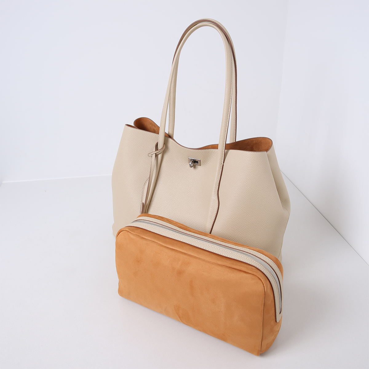 Im Inneren befindet sich eine große, passende Reißverschlusstasche, in der Sie Ihre wichtigsten Utensilien sicher und bequem verstauen können. Der Shopper selbst ist geräumig genug, um einen 13-Zoll-Laptop zu transportieren, ohne auf Stil oder Komfort verzichten zu müssen. Dank der langen Griffe können Sie ihn auch an hektischen Tagen mühelos über der Schulter tragen.