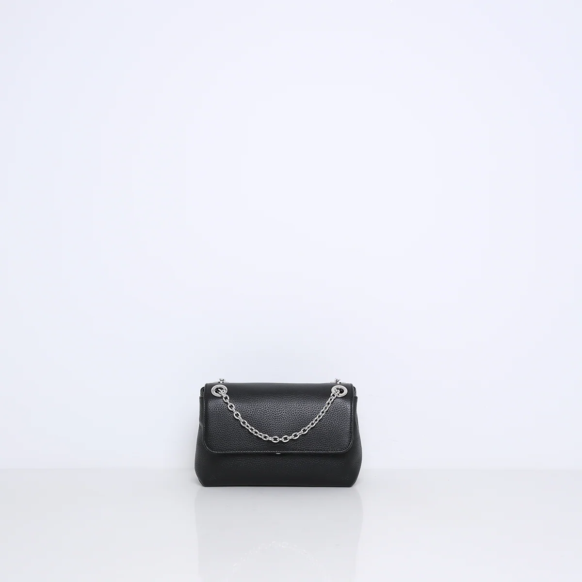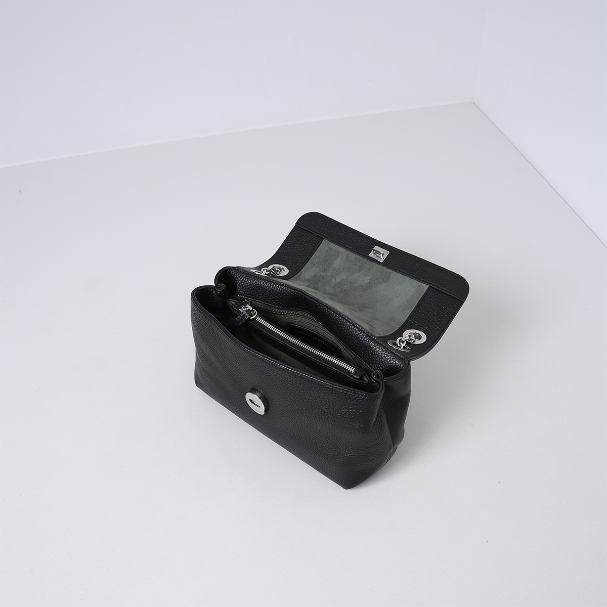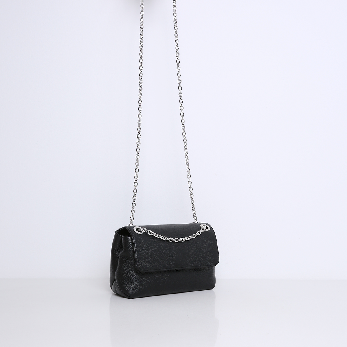 Die Tasche hat zwei Innenfächer, die durch ein mittleres Reißverschlussfach getrennt sind. Sie verfügt außerdem über mehrere Innenfächer und ist mit Veloursleder (Viskose) gefüttert. Die Tasche wird an der Vorderseite geöffnet und mit einem Druckknopf verschlossen. In der Mitte ist die Tasche mit einer silberfarbenen Kette aus Leder versehen, so dass sie bequem über der Schulter getragen werden kann. Die Tasche ist aus weichem und geschmeidigem Leder gefertigt.