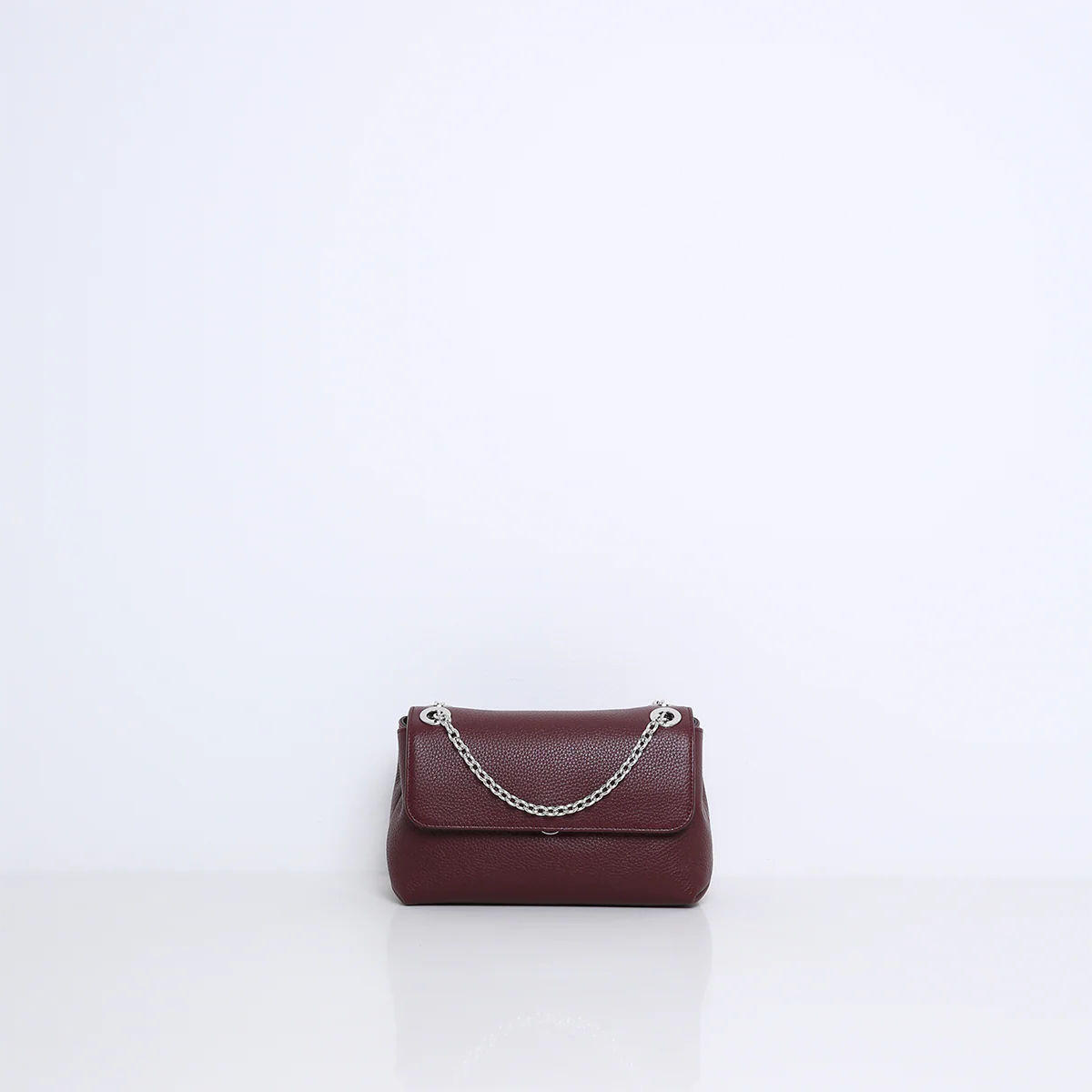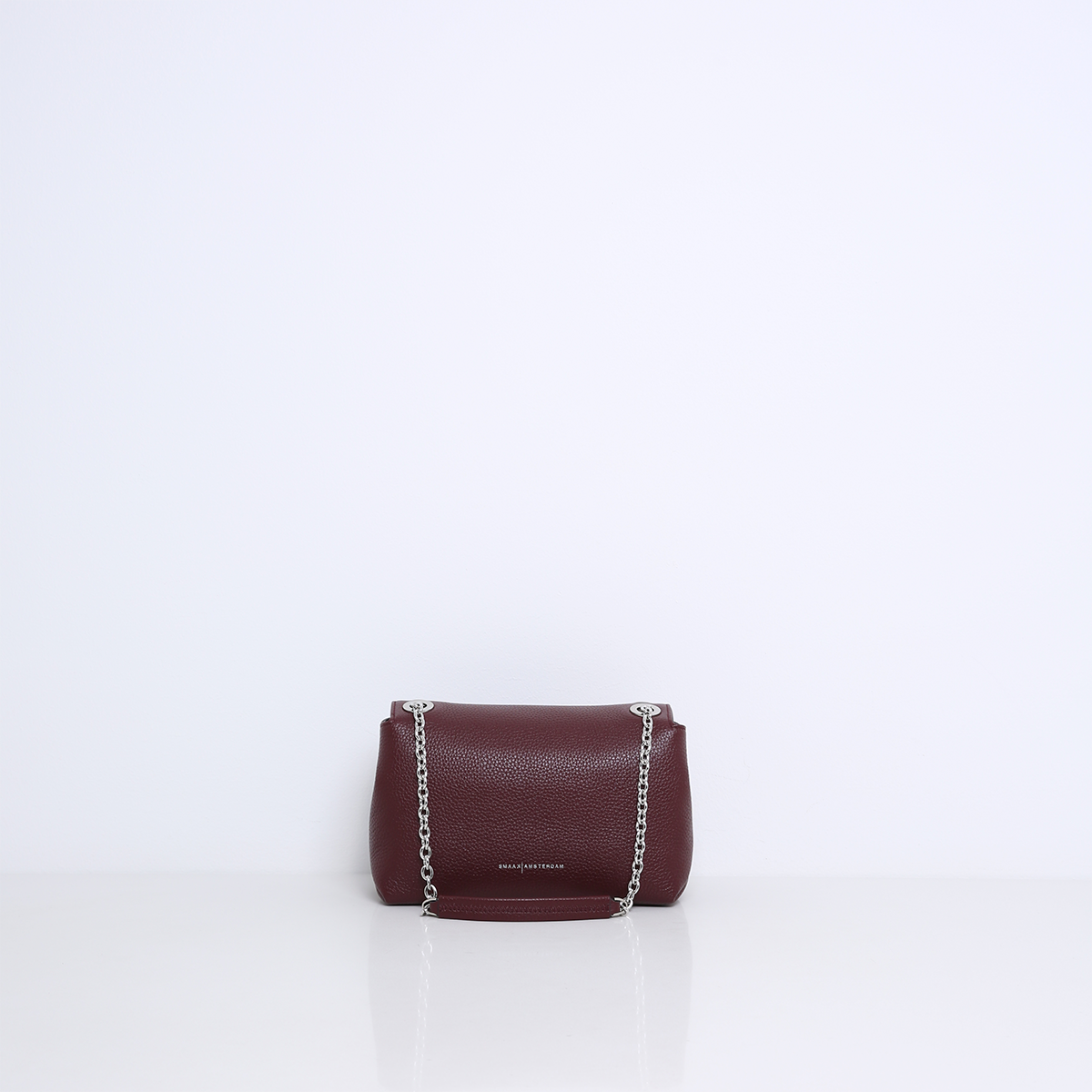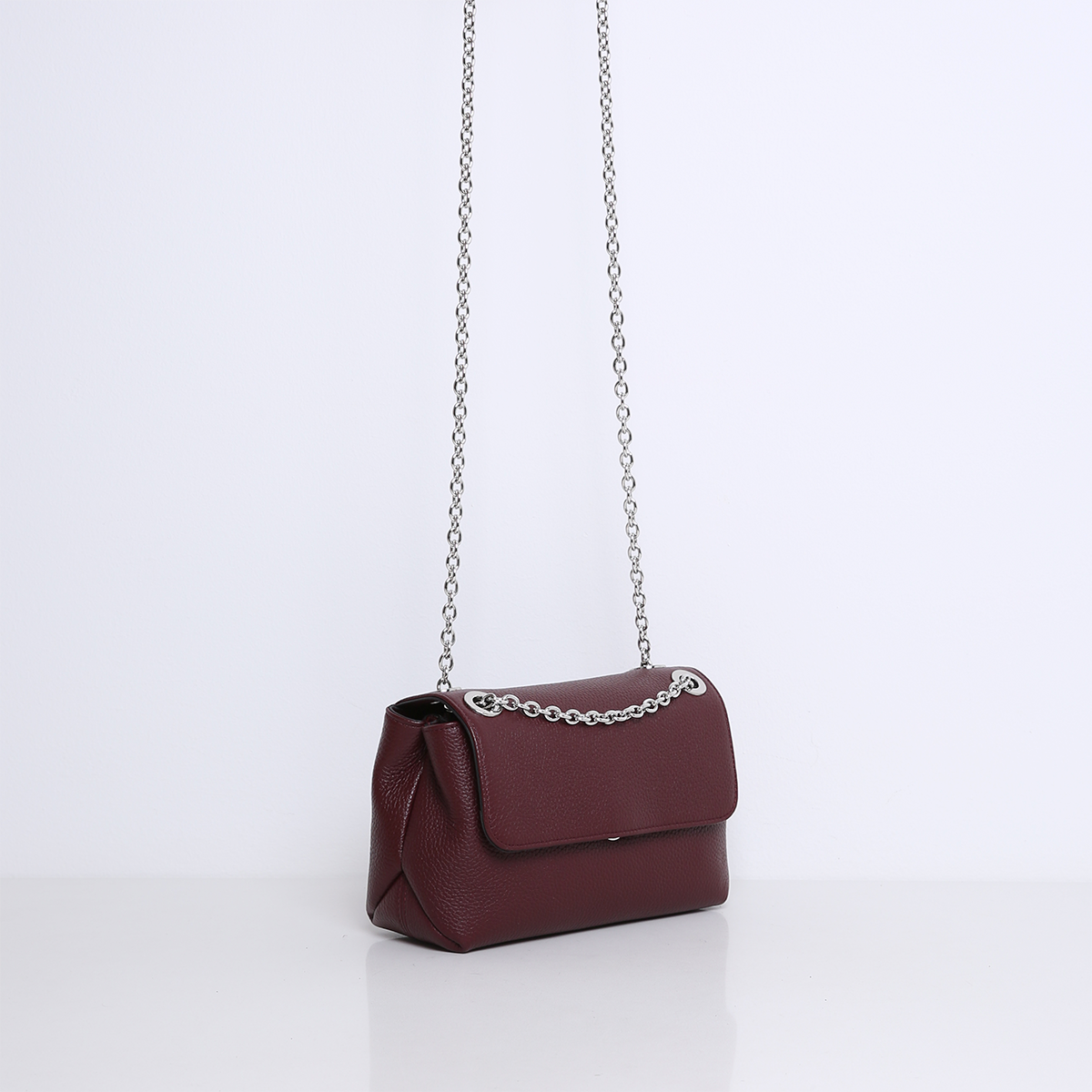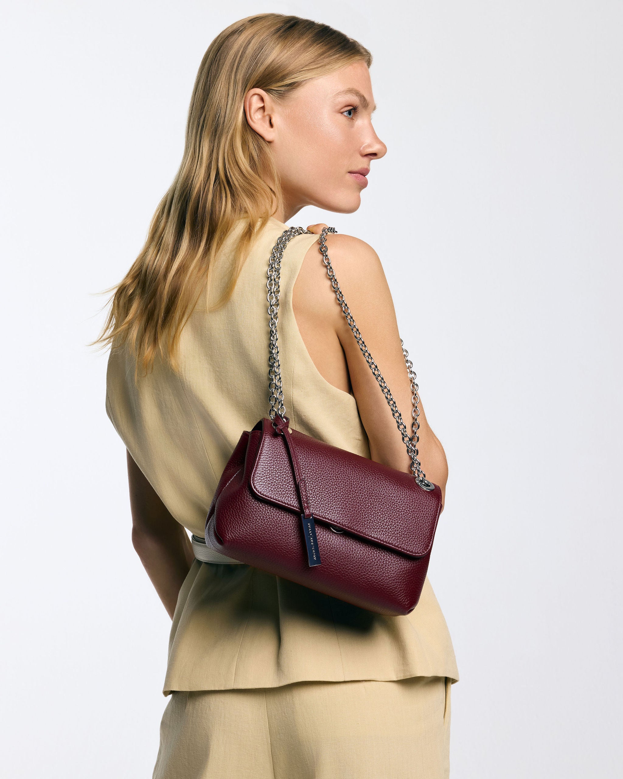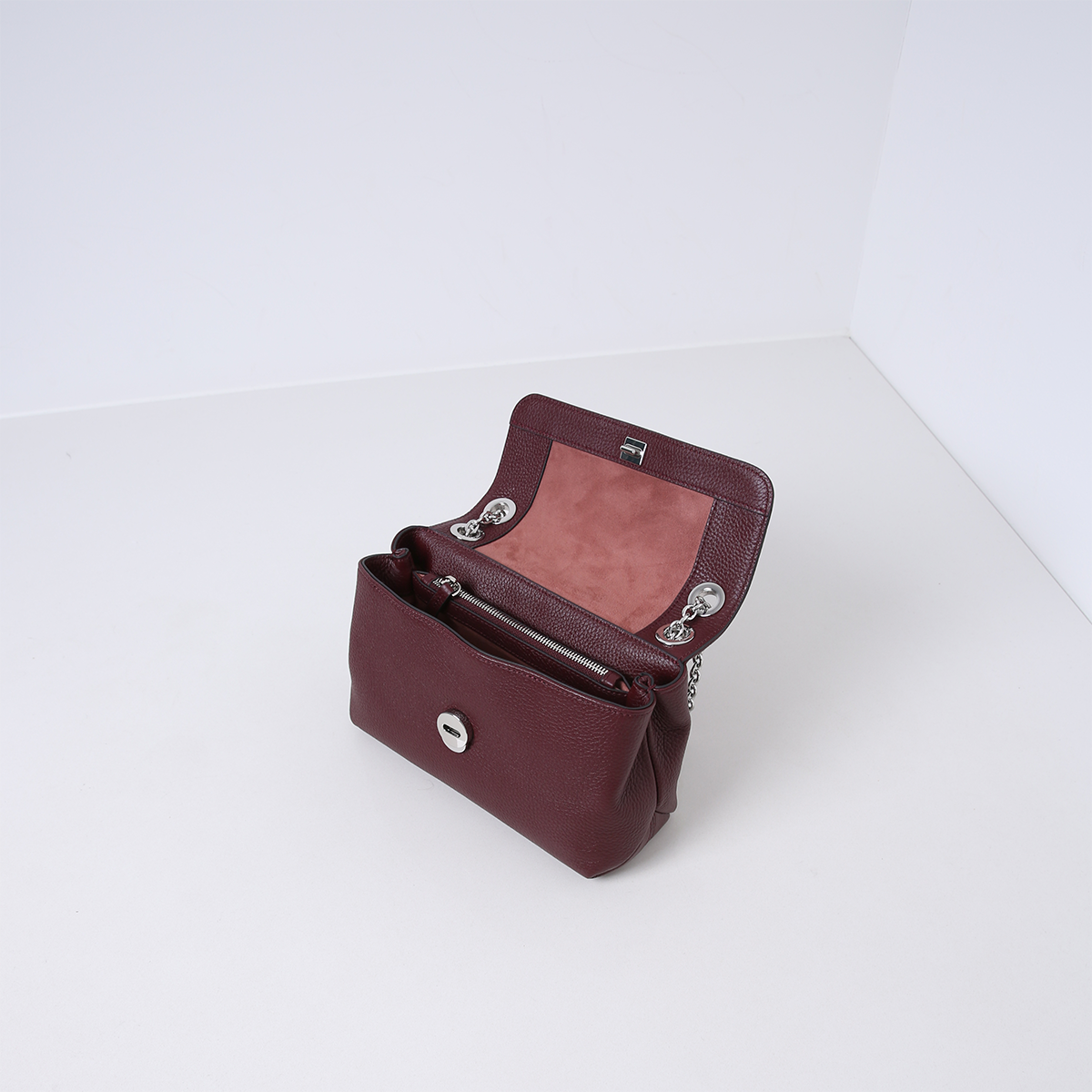Die Tasche hat zwei Innenfächer, die durch ein mittleres Reißverschlussfach getrennt sind. Sie verfügt außerdem über mehrere Innenfächer und ist mit Veloursleder (Viskose) gefüttert. Die Tasche wird an der Vorderseite geöffnet und mit einem Druckknopf verschlossen. In der Mitte ist die Tasche mit einer silberfarbenen Kette aus Leder versehen, so dass sie bequem über der Schulter getragen werden kann. Die Tasche ist aus weichem und geschmeidigem Leder gefertigt.