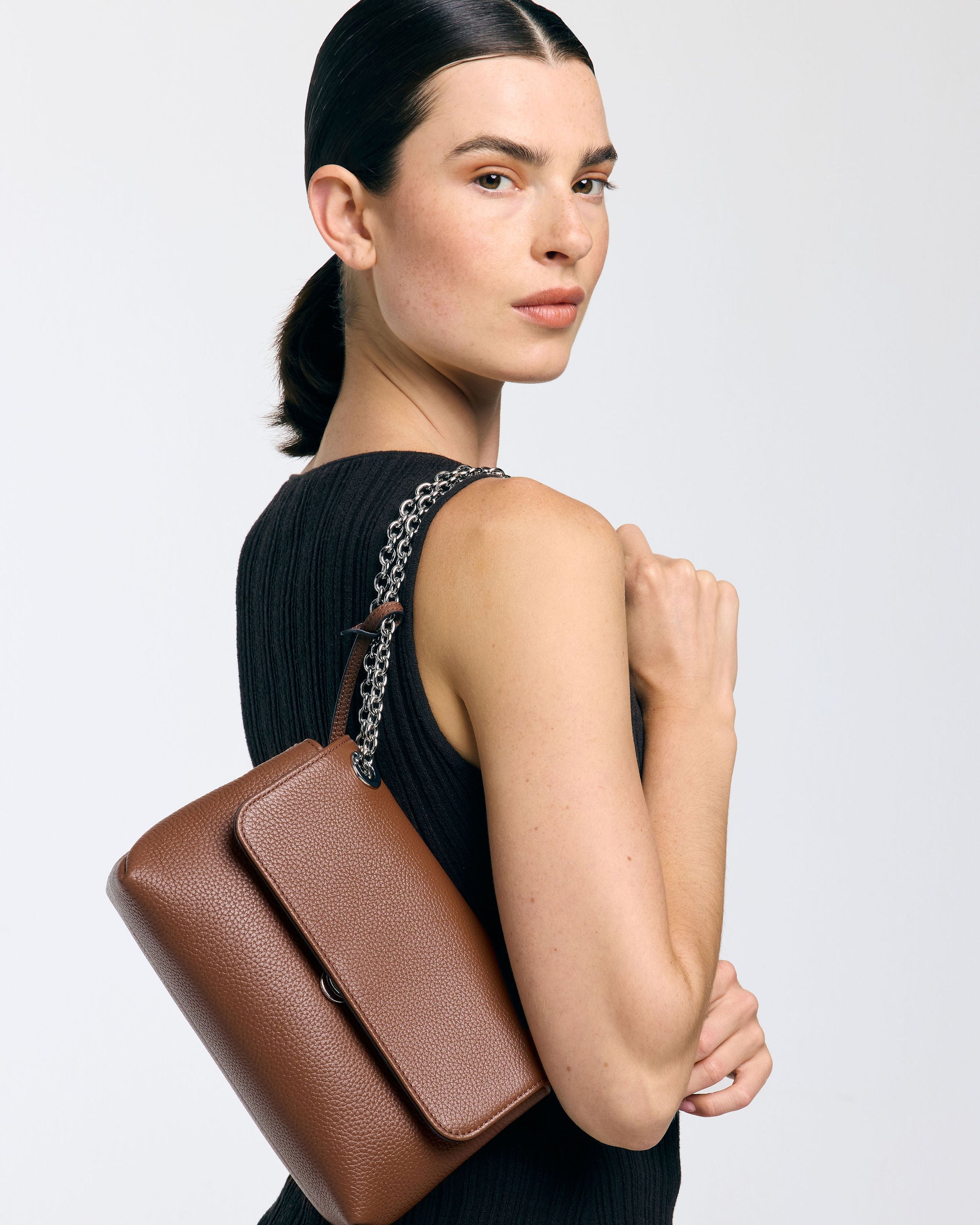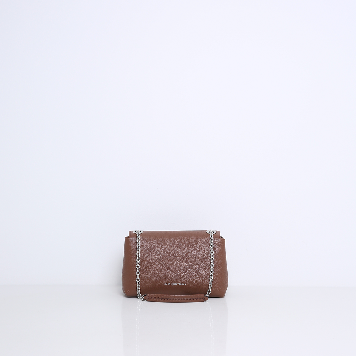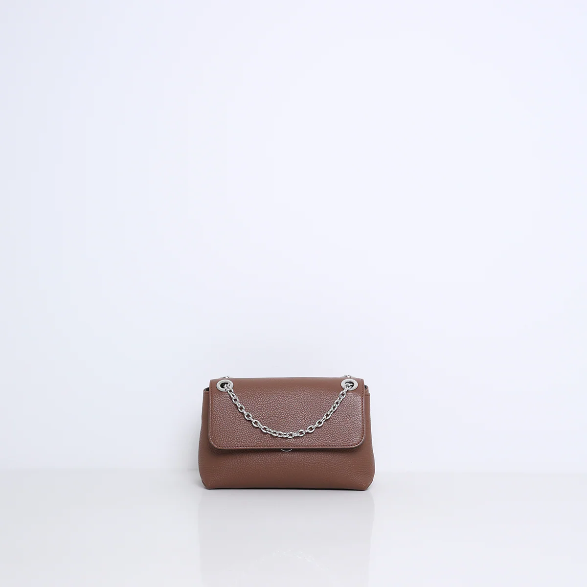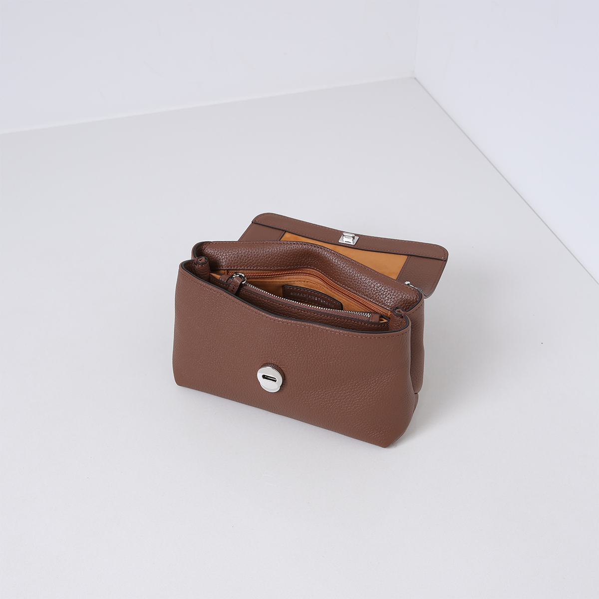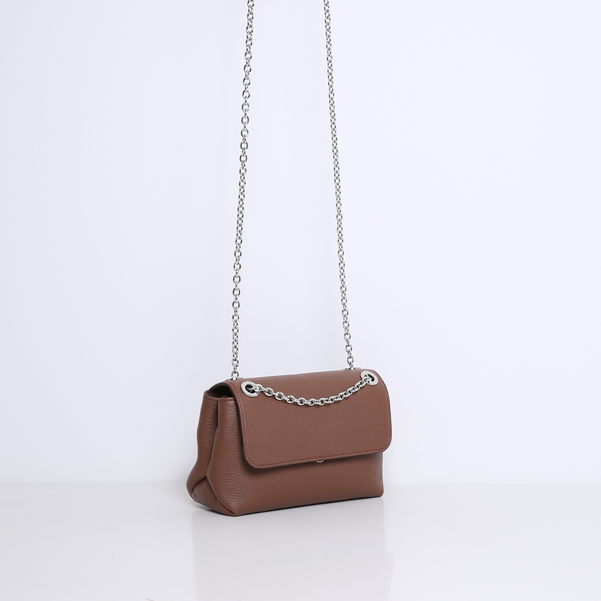 Die Tasche hat zwei Innenfächer, die durch ein mittleres Reißverschlussfach getrennt sind. Sie verfügt außerdem über mehrere Innenfächer und ist mit Veloursleder (Viskose) gefüttert. Die Tasche wird an der Vorderseite geöffnet und mit einem Druckknopf verschlossen. In der Mitte ist die Tasche mit einer silberfarbenen Kette aus Leder versehen, so dass sie bequem über der Schulter getragen werden kann. Die Tasche ist aus weichem und geschmeidigem Leder gefertigt.