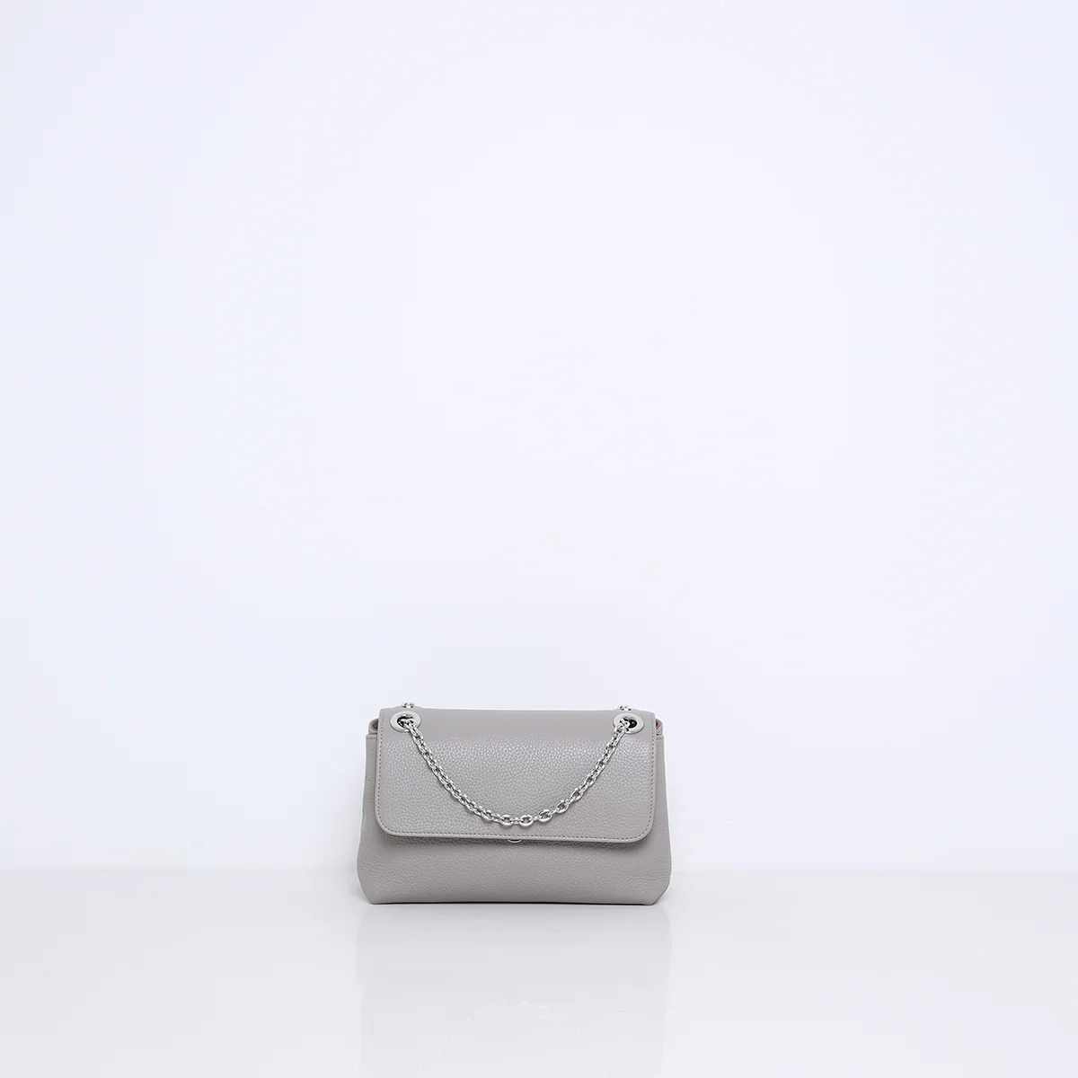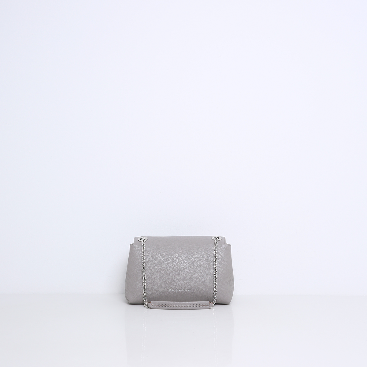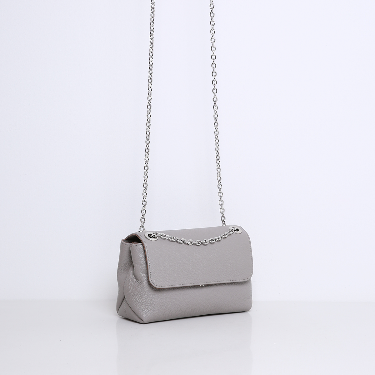 Die Tasche hat zwei Innenfächer, die durch ein mittleres Reißverschlussfach getrennt sind. Sie verfügt außerdem über mehrere Innenfächer und ist mit Veloursleder (Viskose) gefüttert. Die Tasche wird an der Vorderseite geöffnet und mit einem Druckknopf verschlossen. In der Mitte ist die Tasche mit einer silberfarbenen Kette aus Leder versehen, so dass sie bequem über der Schulter getragen werden kann. Die Tasche ist aus weichem und geschmeidigem Leder gefertigt.
