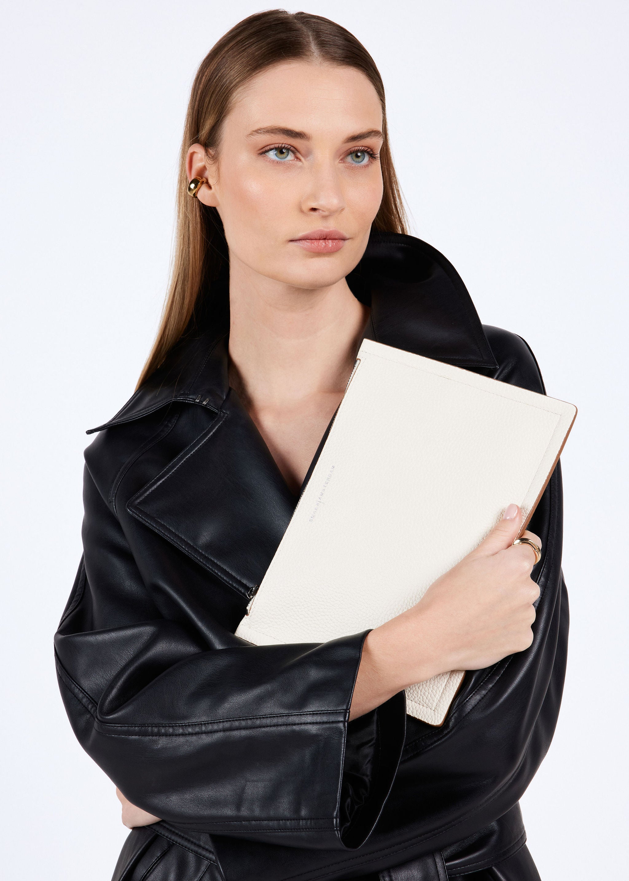 Entdecken Sie unser vielseitiges Lederetui, das sich perfekt als Clutch oder als zusätzliche Innentasche verwenden lässt. Diese stilvolle Tasche hat keine zusätzlichen Innentaschen und ist daher wunderbar geräumig und schlicht. Die Innenseite ist mit luxuriösem Veloursleder (Viskose) gefüttert, das sich weich anfühlt und Ihre Habseligkeiten zusätzlich schützt. Der Reißverschluss an der Oberseite sorgt dafür, dass alles sicher verstaut ist. Dank ihres flachen Designs passt diese Tasche problemlos in größere Taschen, während sie als Clutch eine elegante Ergänzung zu ELKEm Outfit ist.