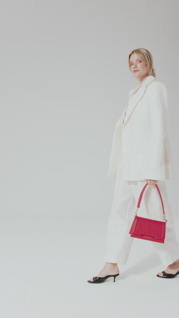 Die BITTI wird an der Vorderseite mit einem Schnappverschluss geöffnet. Im Inneren hat die Tasche zwei Fächer und ein zusätzliches offenes Fach auf der Rückseite und ist mit Suedine (Viskose) gefüttert. Die Tasche ist aus weichem und geschmeidigem Rindsleder gefertigt. Mit dem abnehmbaren Lederschulterriemen können Sie die Umhängetasche auch als Crossbody-Bag tragen.