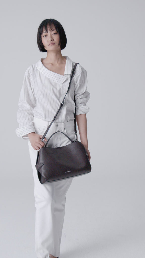 Eine geräumige, offene Umhängetasche mit einer weichen, leicht gewölbten Silhouette. Die Tasche hat eine elegante, lockere Form und sieht durch den stabilen, etwas breiteren Boden und die dezenten Seitenteile sehr schön aus. Ein schönes Modell für jeden Tag, mit ausreichend Platz, ohne klobig zu wirken.