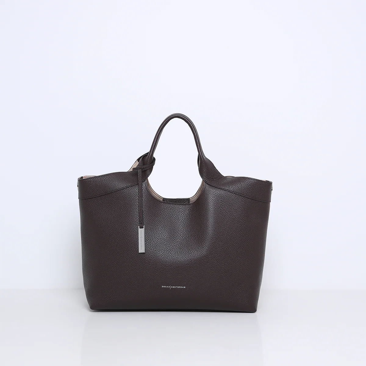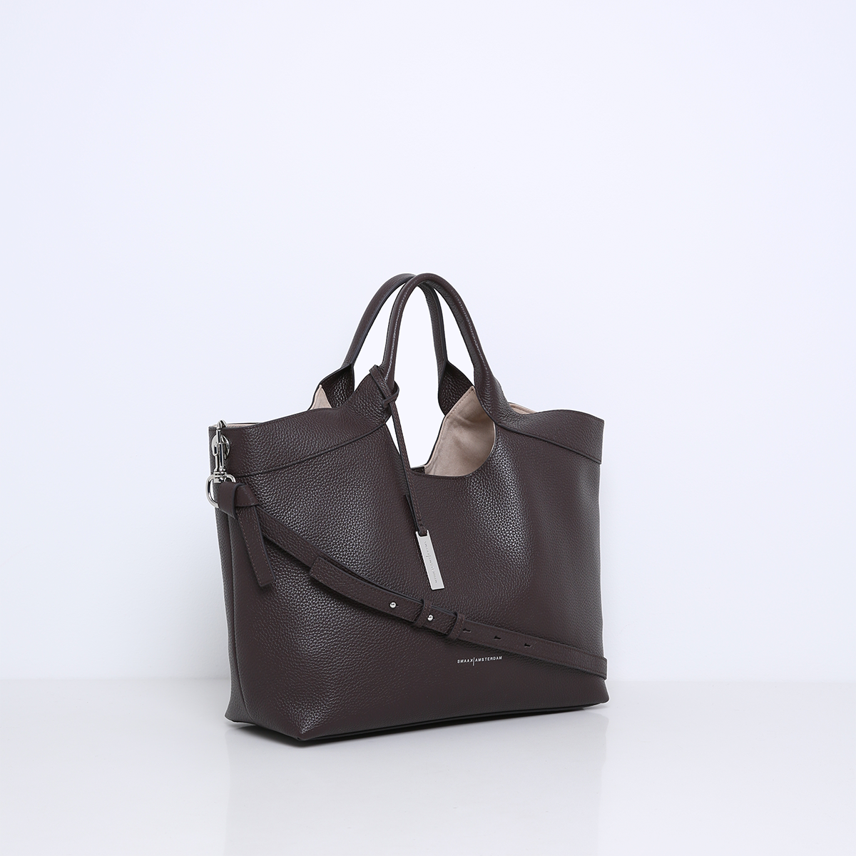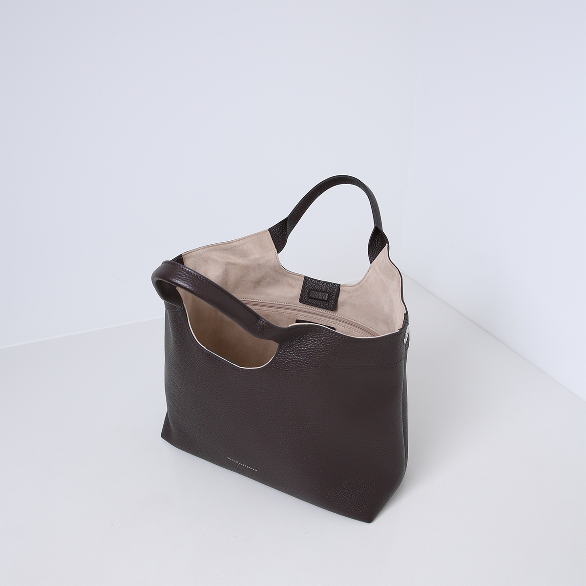 Die Tasche ist aus weichem, geschmeidigem Rindsleder gefertigt. Sie verfügt über mehrere Innenfächer und ist mit Wildleder (Viskose) gefüttert. Der abnehmbare, verstellbare Schulterriemen erlaubt es, die Tasche auch als Crossbody zu tragen.