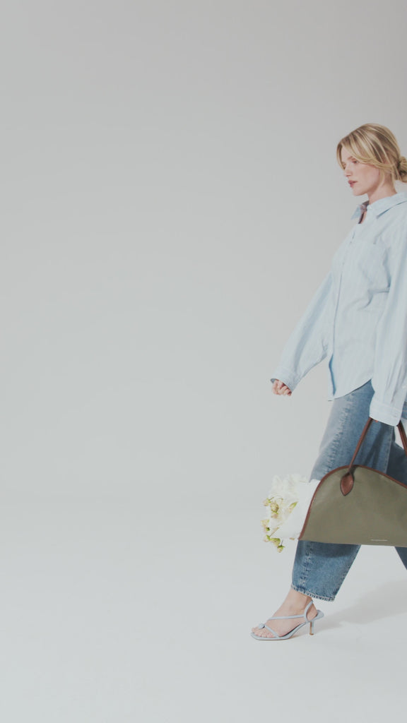 Die Größe L eignet sich für mittelgroße bis größere Blumensträuße, bietet aber auch reichlich Platz, um kleinere Blumen stilvoll zu tragen. Die auffällige Silhouette spielt mit Form und Erwartung: sanft und feminin, mit einem coolen Touch. Die offene, abgerundete Seite gibt den Blick auf einen dezenten Blumenstrauß frei, als ob man stets einen Hauch von Romantik bei sich trüge.