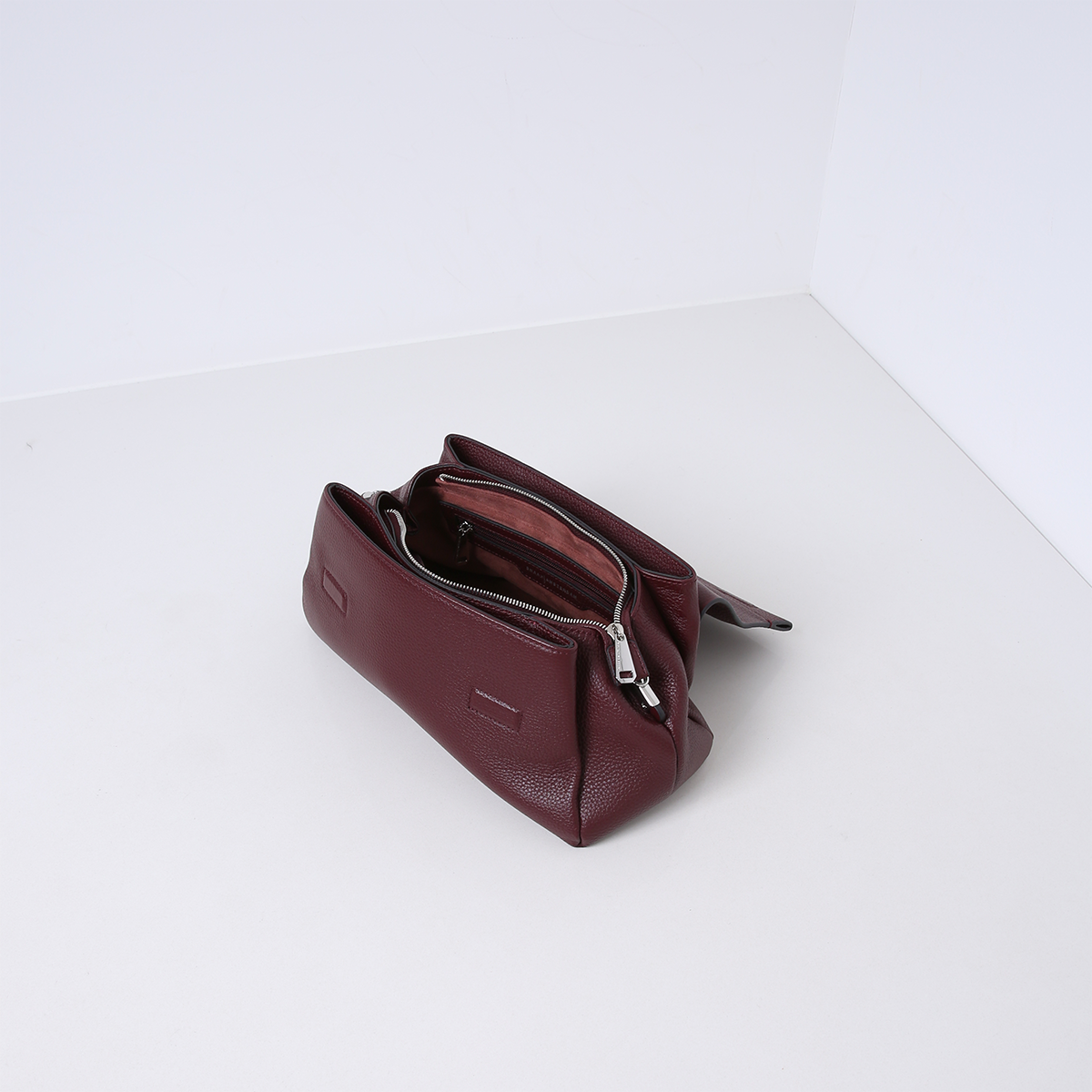 Die Tasche hat zwei abnehmbare Griffe, einen kurzen Schulterriemen und einen langen, längenverstellbaren Querriemen. Die Tasche ist aus weichem und geschmeidigem Rindsleder gefertigt und mit Veloursleder (Viskose) gefüttert.