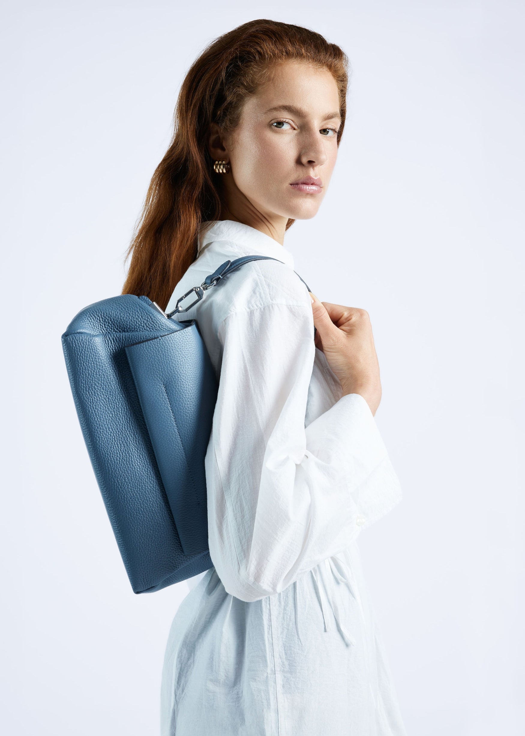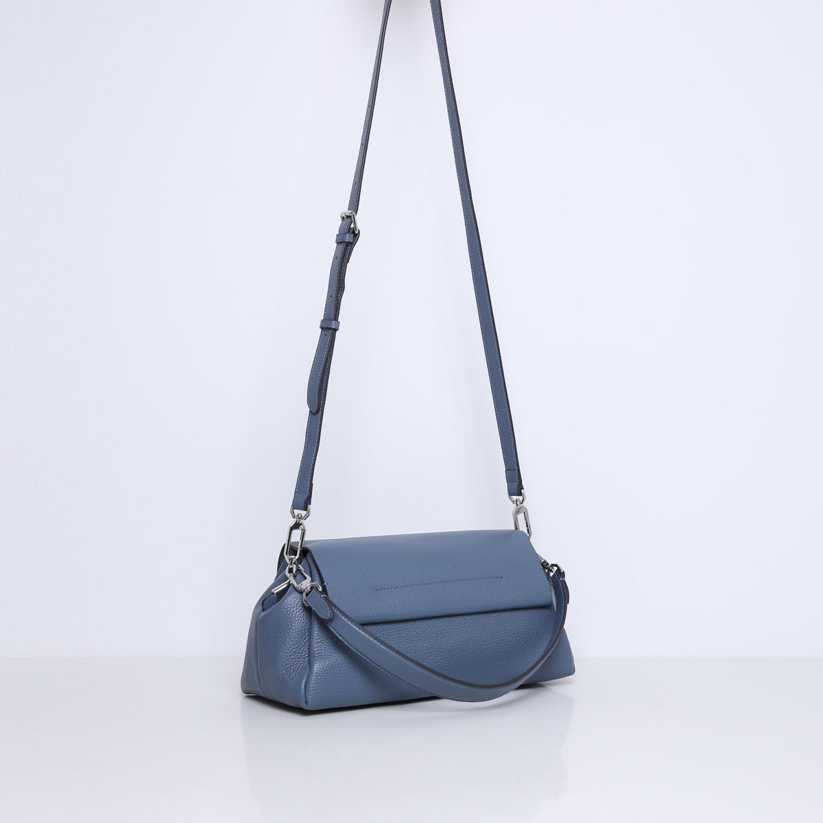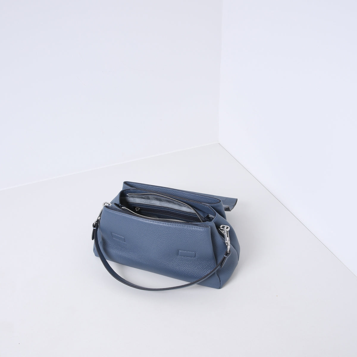 Die Tasche hat zwei abnehmbare Griffe, einen kurzen Schulterriemen und einen langen, längenverstellbaren Querriemen. Die Tasche ist aus weichem und geschmeidigem Rindsleder gefertigt und mit Veloursleder (Viskose) gefüttert.