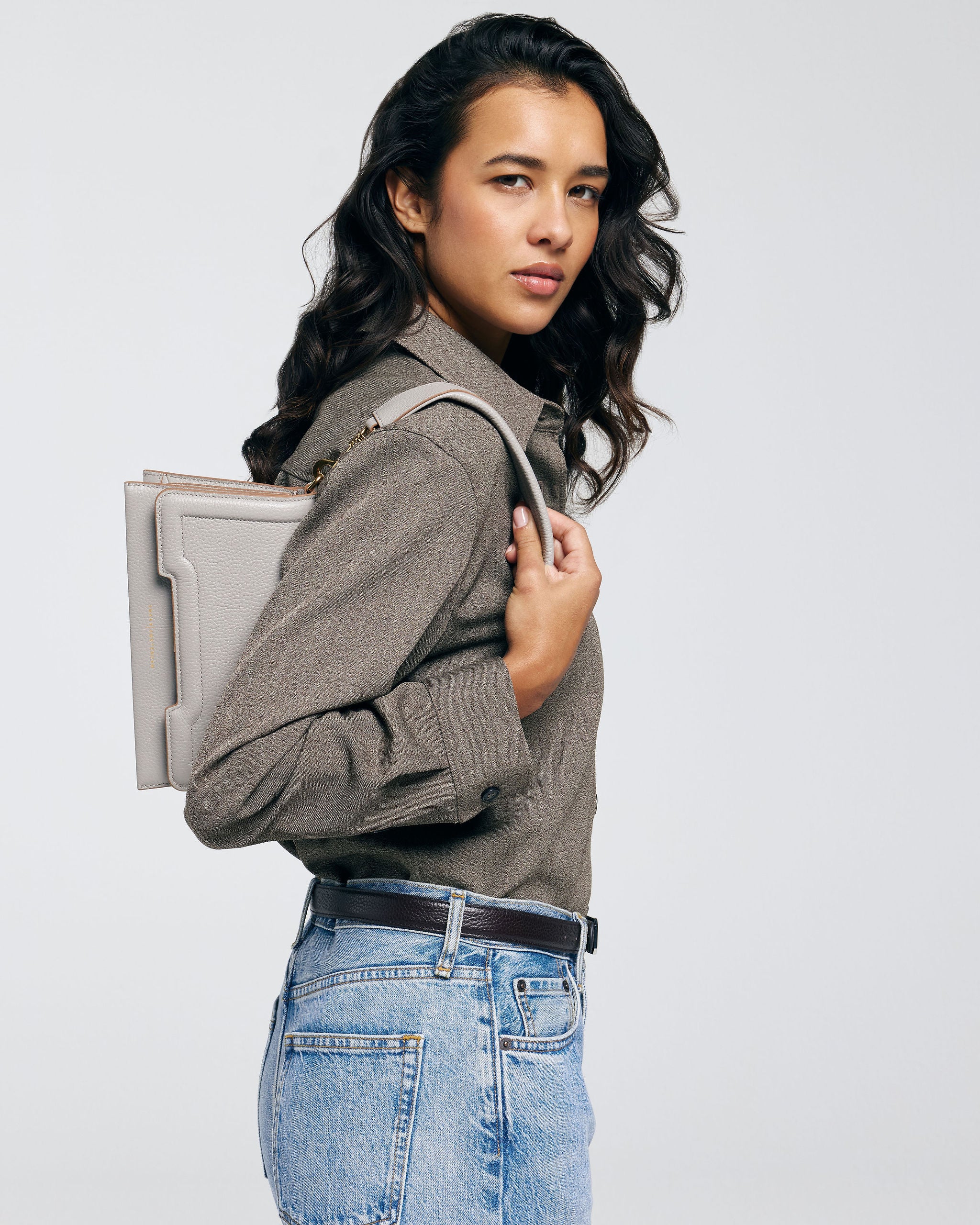 Das Design hat einen feinen Griff und schöne Details am Schulterriemen. Einzigartig ist die Anordnung der Fächer, die an ein Akkordeon erinnert.