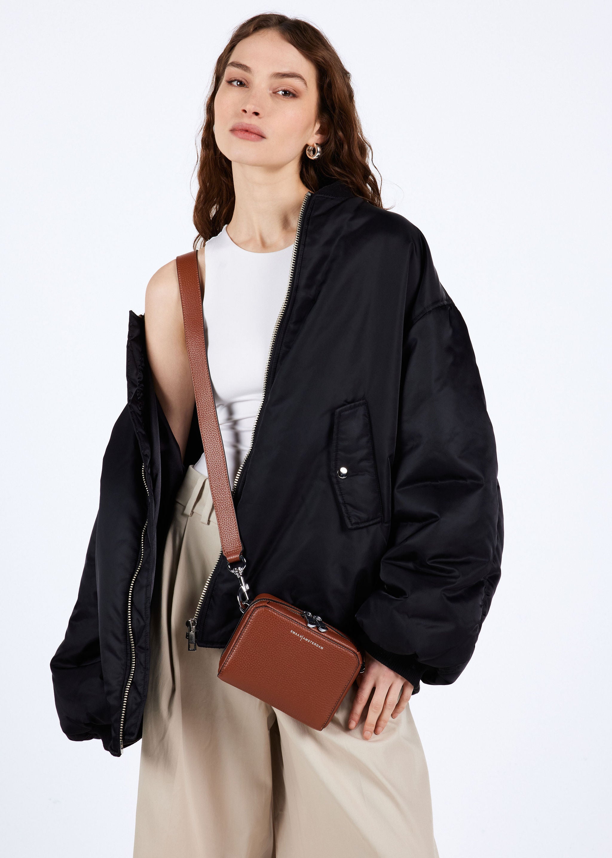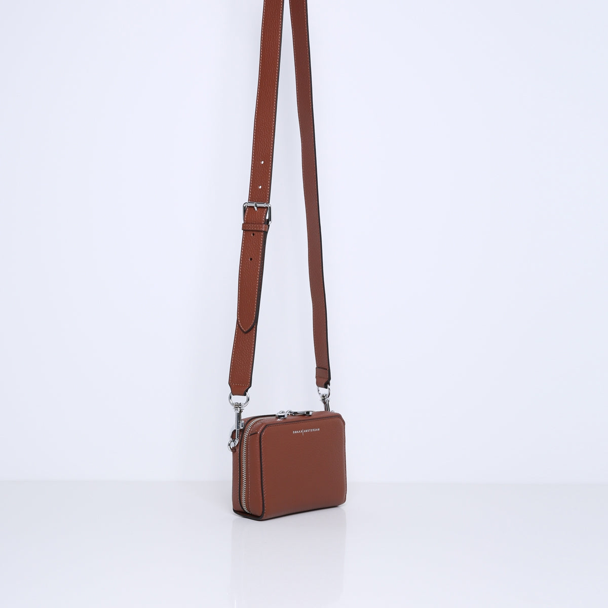 Die Tasche ist aus weichem und geschmeidigem Rindsleder gefertigt. Sie hat zwei kleine Innentaschen und ist mit Veloursleder (Viskose) gefüttert.