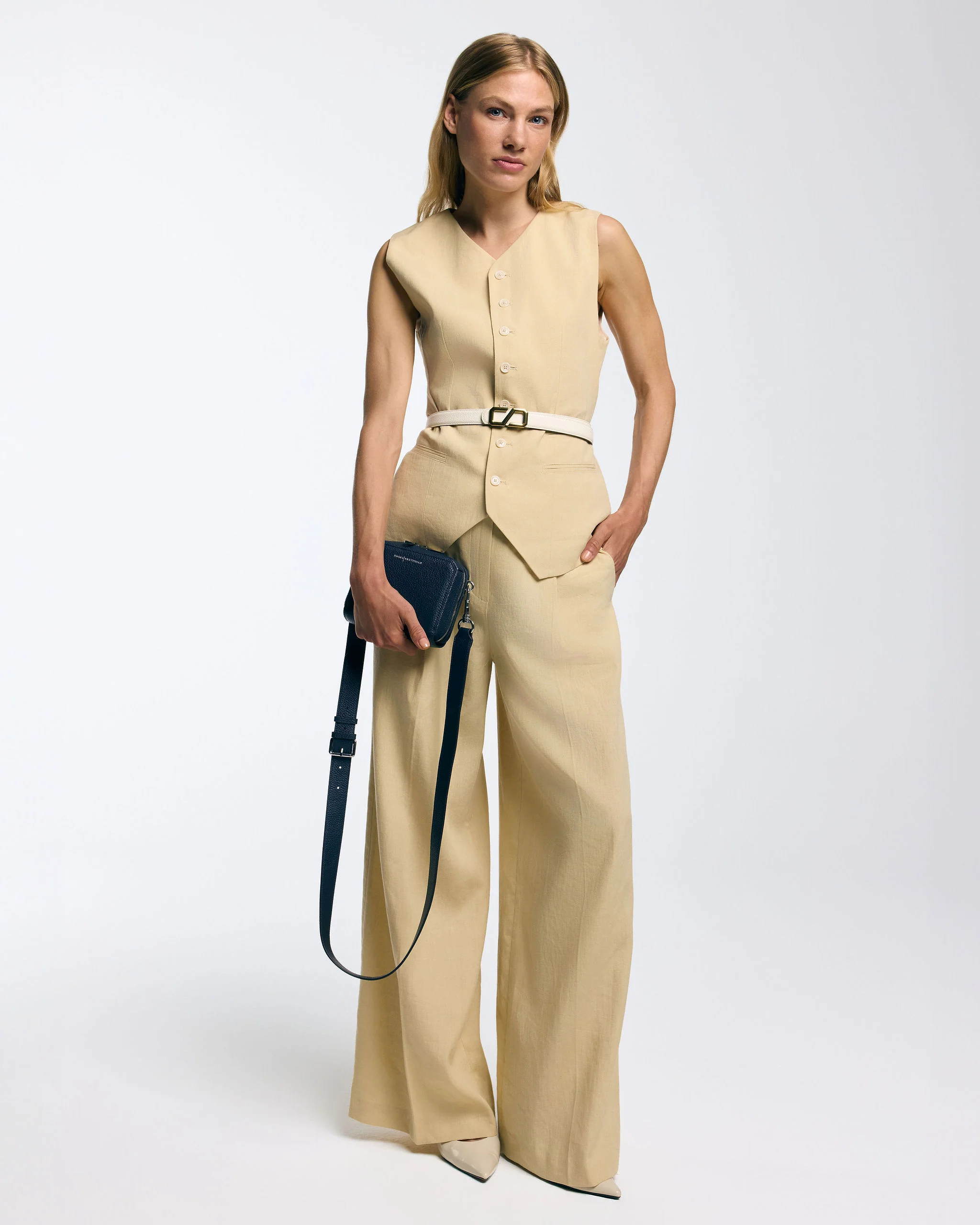 Die Tasche ist aus weichem und geschmeidigem Rindsleder gefertigt. Sie hat zwei kleine Innentaschen und ist mit Veloursleder (Viskose) gefüttert.