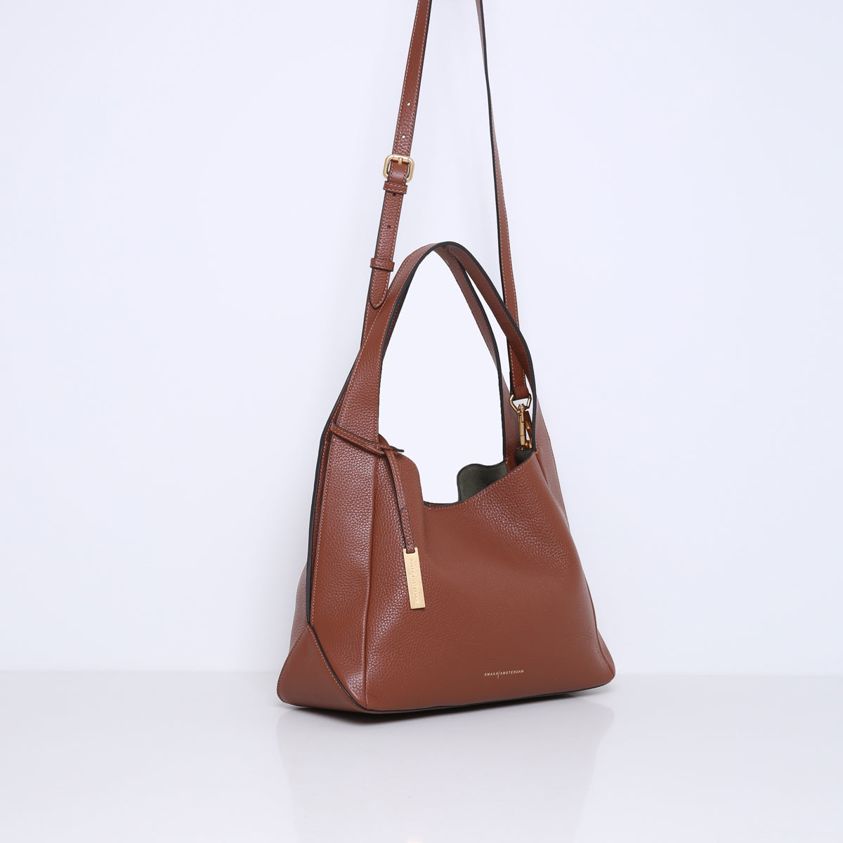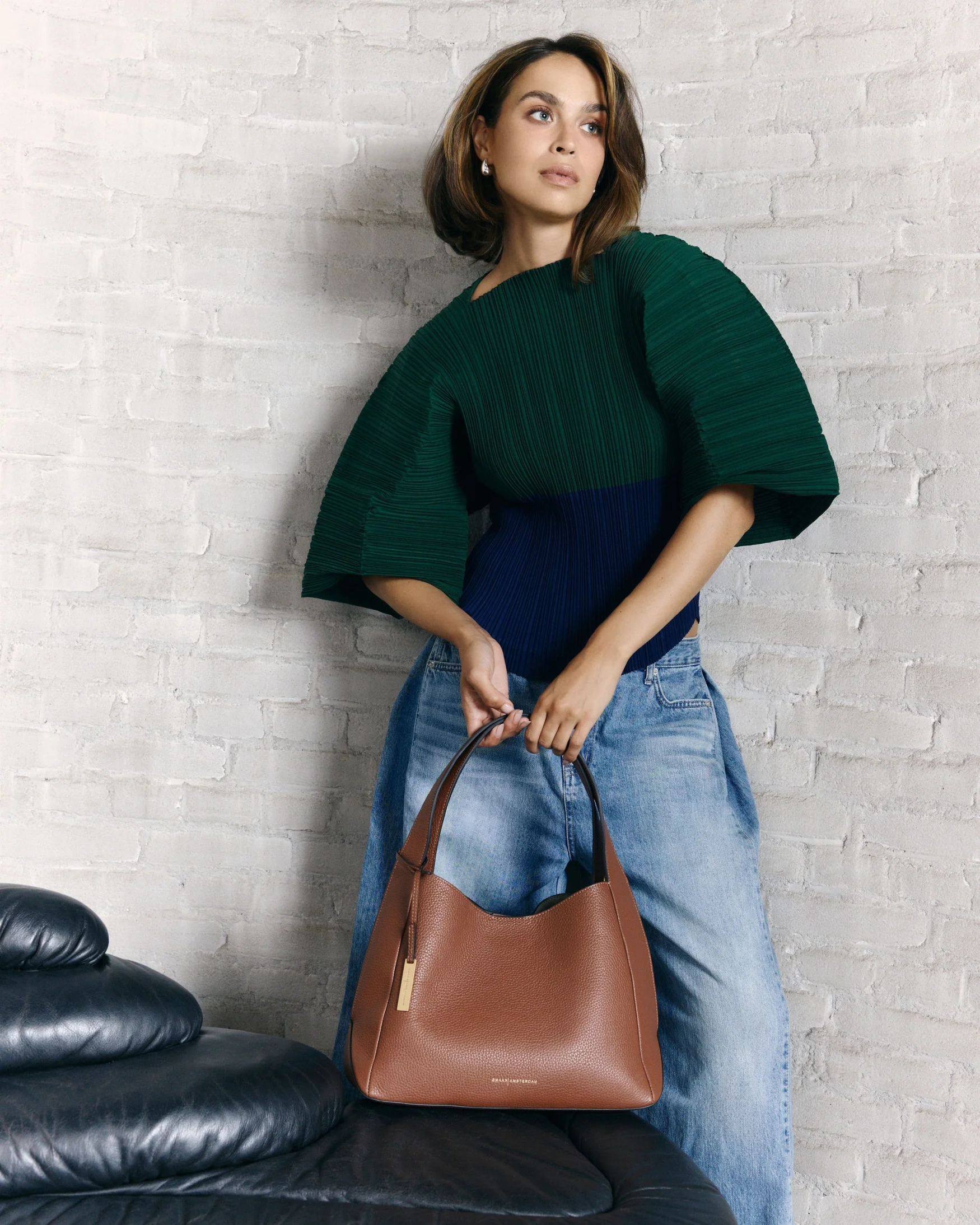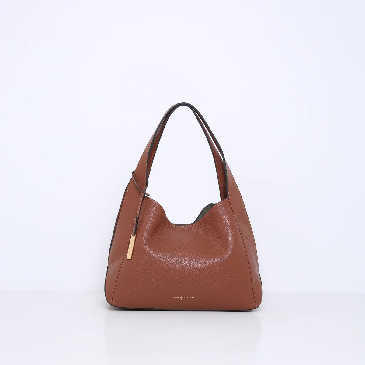 Die Handtasche hat zwei robuste Ledergriffe, die nahtlos in die Seiten der Tasche übergehen, wo sie in einem eleganten Spalt enden. Diese Schlitze sind nicht nur ein raffiniertes Detail, sondern sorgen auch für zusätzliche Flexibilität und Komfort beim Tragen. Dieses große Modell eignet sich perfekt für den täglichen Gebrauch und bietet ausreichend Platz für alle wichtigen Dinge, einschließlich eines 13-Zoll-Laptops ohne Hülle. Dank des abnehmbaren und verstellbaren Schulterriemens kann die Tasche sowohl in der Hand als auch am Körper getragen werden.