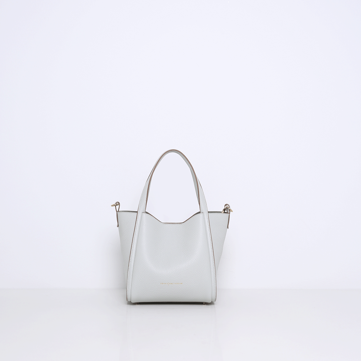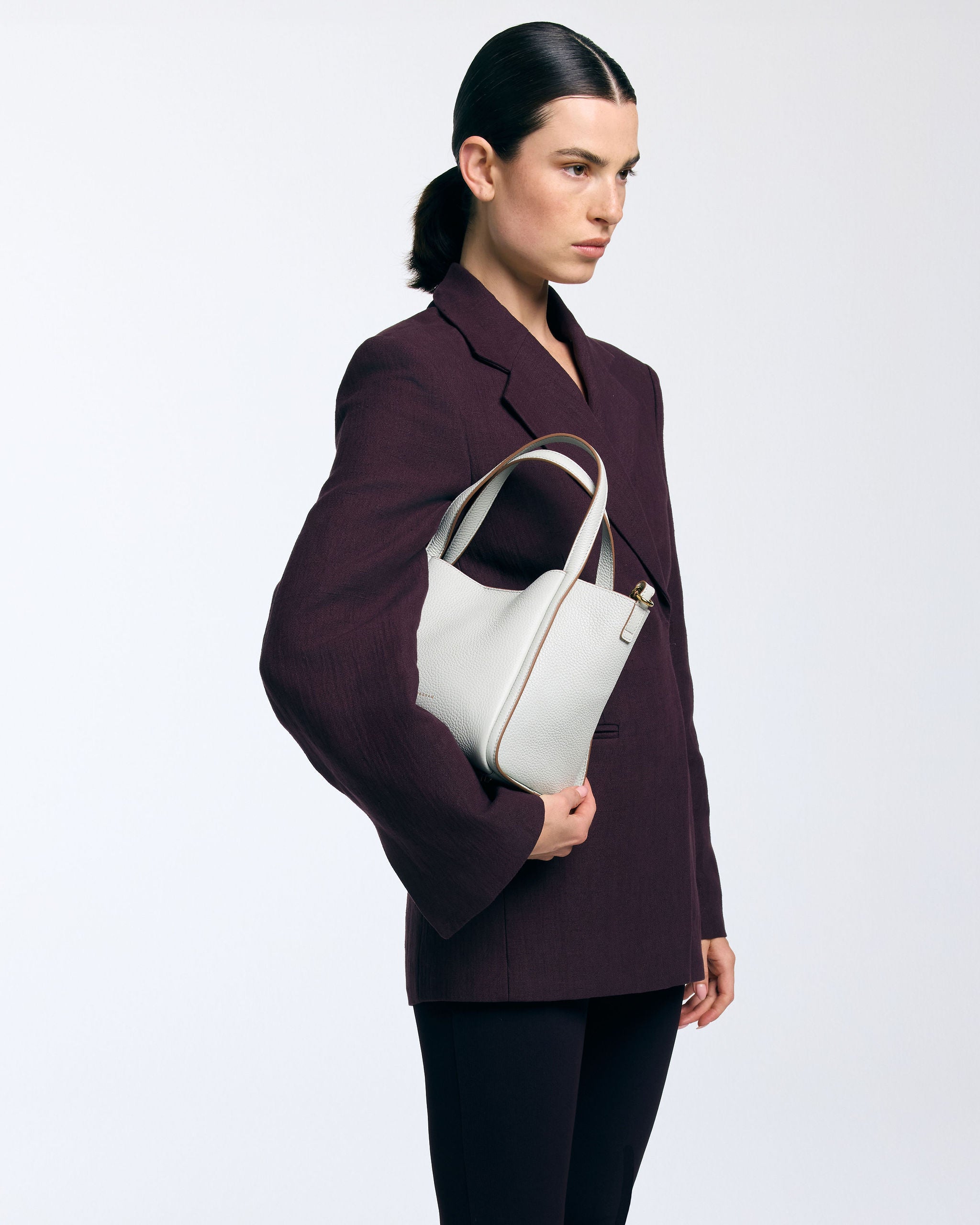 Was die JANE auszeichnet, ist ihr ausgeklügeltes Design und ihre Vielseitigkeit, so dass sie überall eingesetzt werden kann. Die Ledergriffe verlaufen rund um das Design der Tasche. An der Oberseite befindet sich ein zusätzlicher Haken, mit dem man sie horizontal verbinden kann, um das Modell kompakter zu machen und seine Form zu verändern. Es erinnert daher an den Umriss einer Tulpe, einer Blume, die oft mit Schönheit und Anmut assoziiert wird.