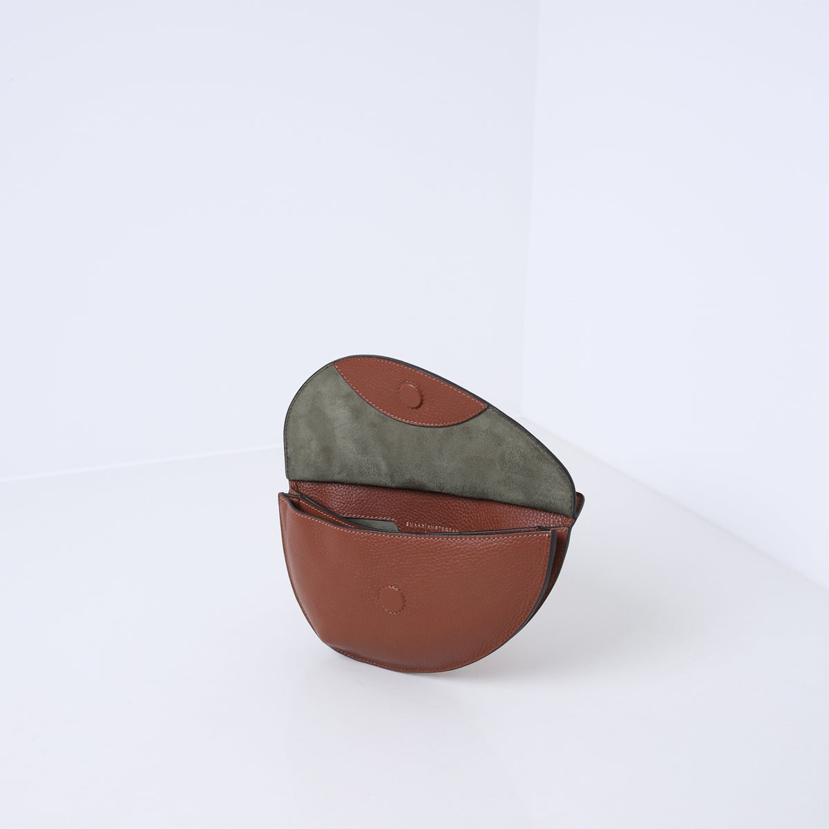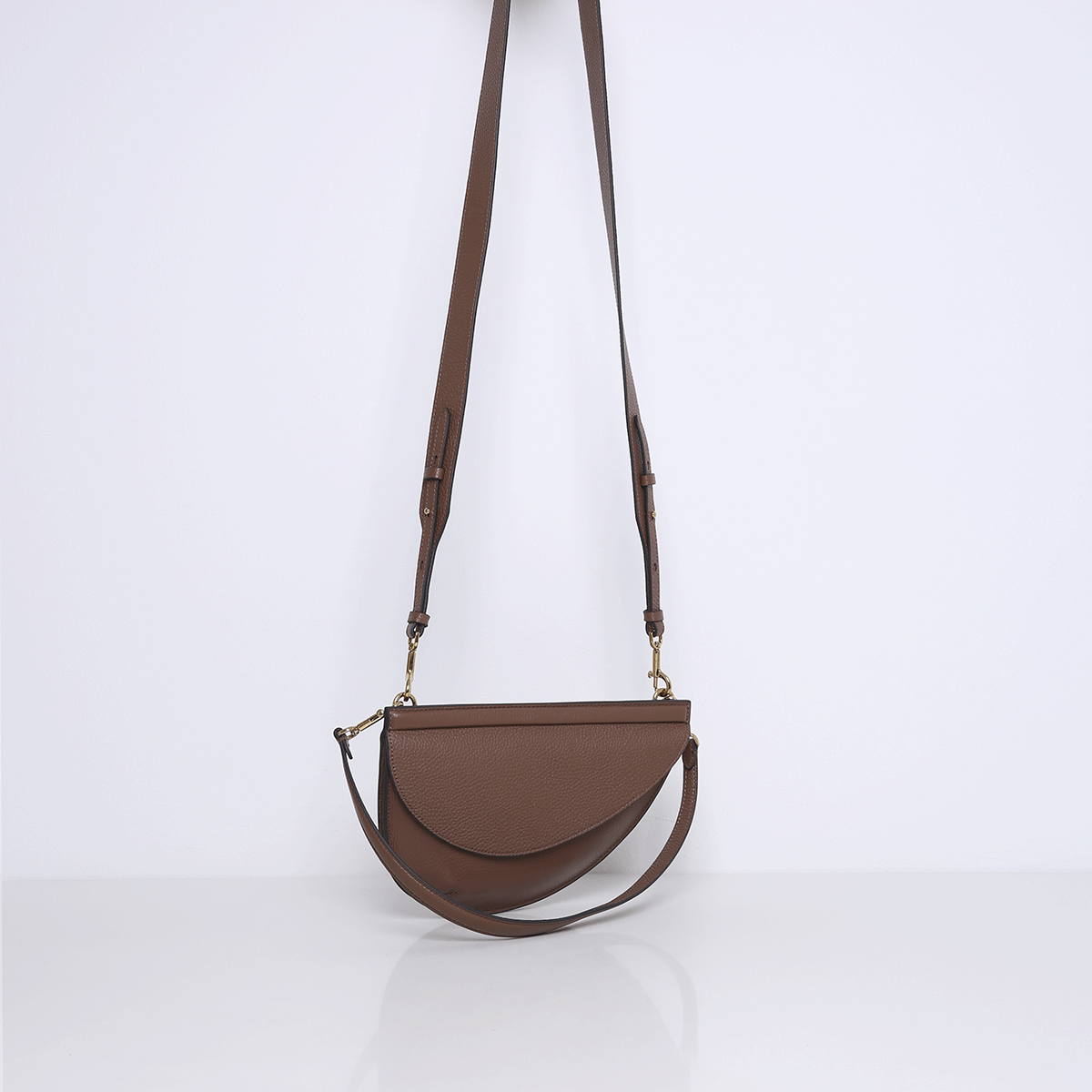 Die Tasche ist aus weichem, geschmeidigem Rindsleder gefertigt. Sie verfügt über mehrere offene Innenfächer und ist mit Veloursleder (Viskose) gefüttert. Der Verschluss ist mit einem Magneten im Leder versehen. Auf der Rückseite befindet sich eine zusätzliche Reißverschlusstasche. Sie hat einen kurzen Schulterriemen und einen langen, längenverstellbaren Querriemen.