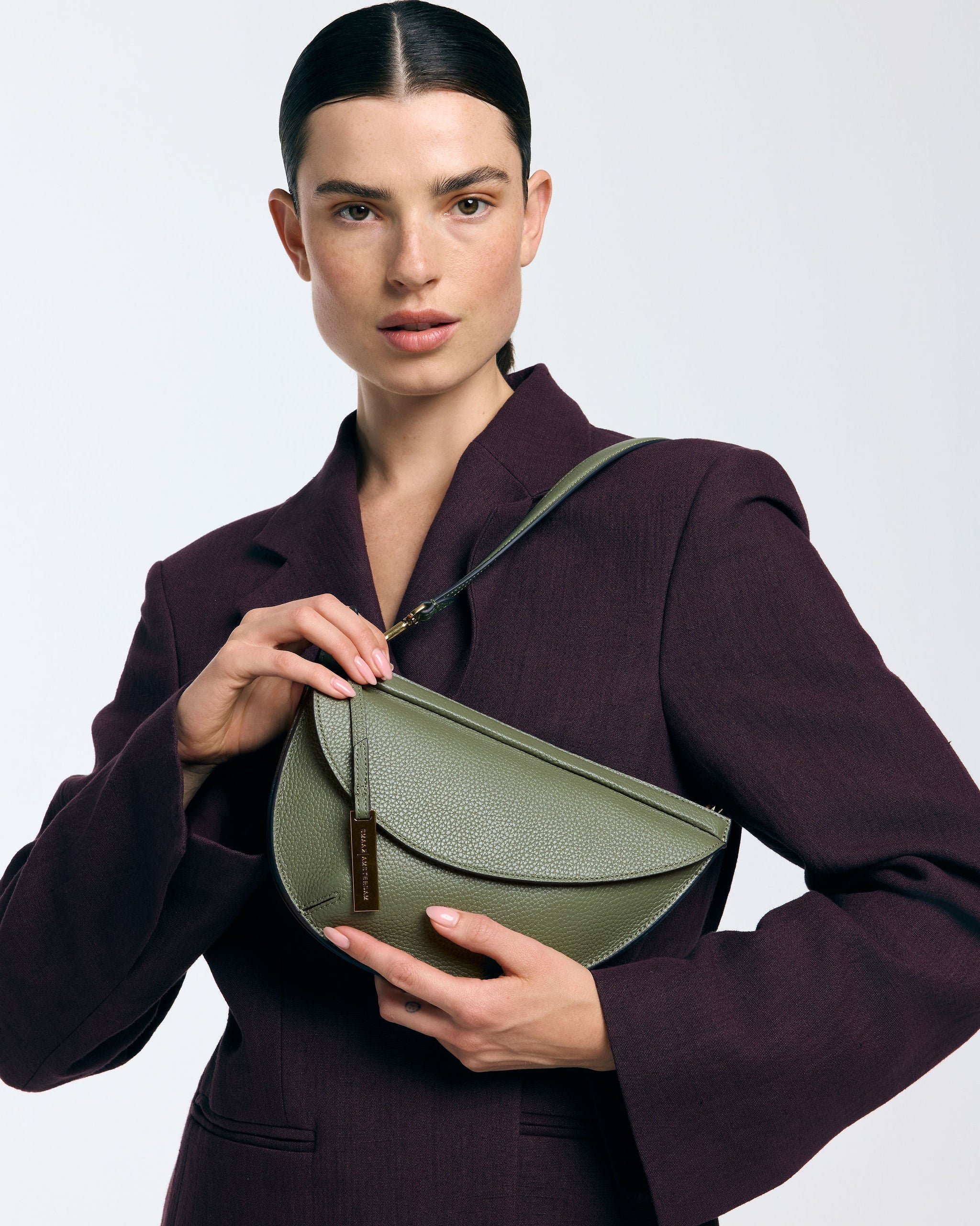 Die Tasche ist aus weichem, geschmeidigem Rindsleder gefertigt. Sie verfügt über mehrere offene Innenfächer und ist mit Veloursleder (Viskose) gefüttert. Der Verschluss ist mit einem Magneten im Leder versehen. Auf der Rückseite befindet sich eine zusätzliche Reißverschlusstasche. Sie hat einen kurzen Schulterriemen und einen langen, längenverstellbaren Querriemen.