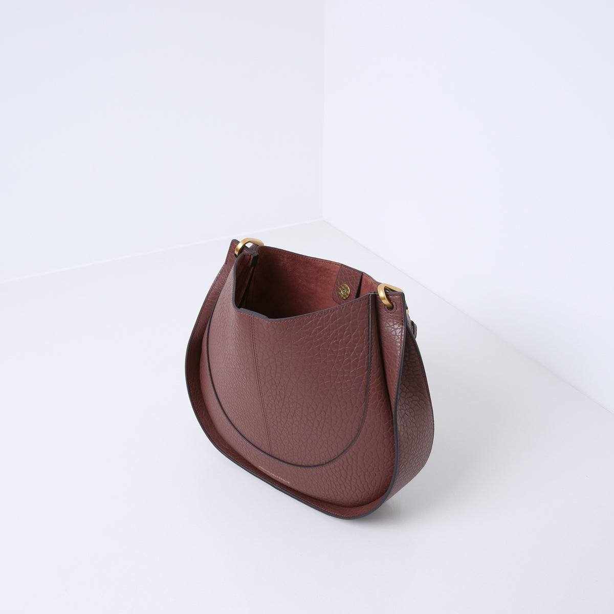 Die Tasche ist aus robustem Rindsleder mit einem Elefantenhaut-Reliefmuster gefertigt. Die Tasche ist oben offen und wird mit einem Magnetverschluss geschlossen. Mit abnehmbarer Reißverschlusstasche aus Veloursleder (Viskose).