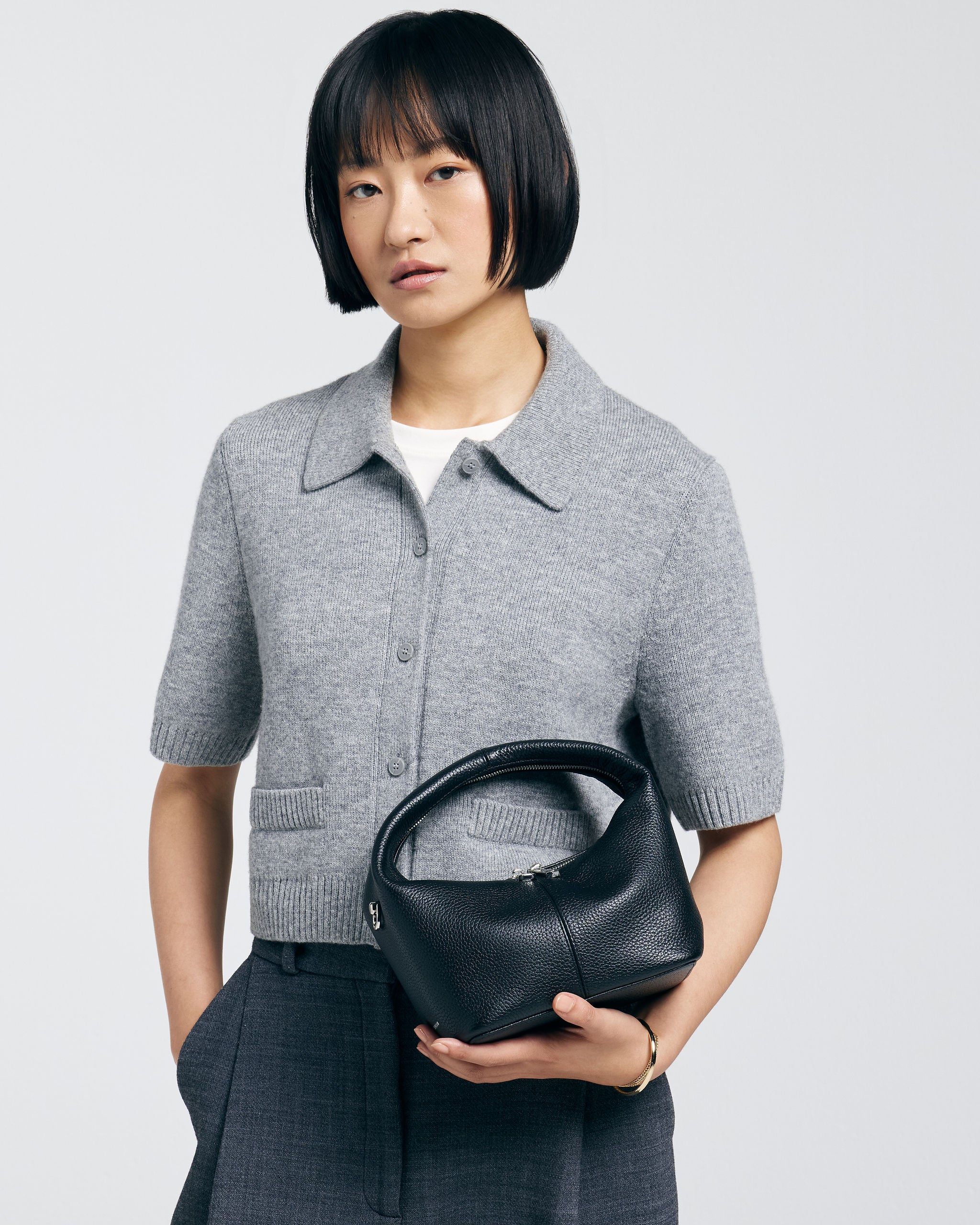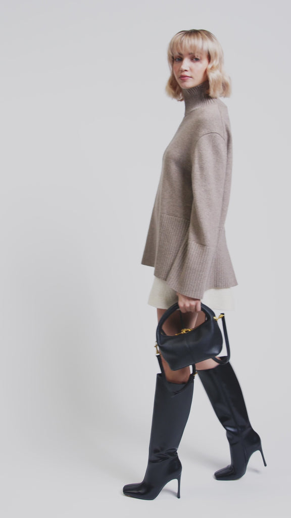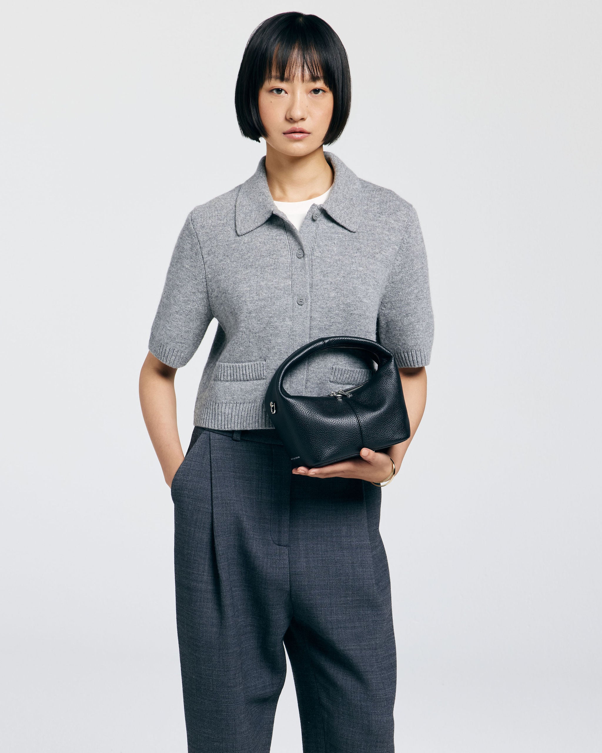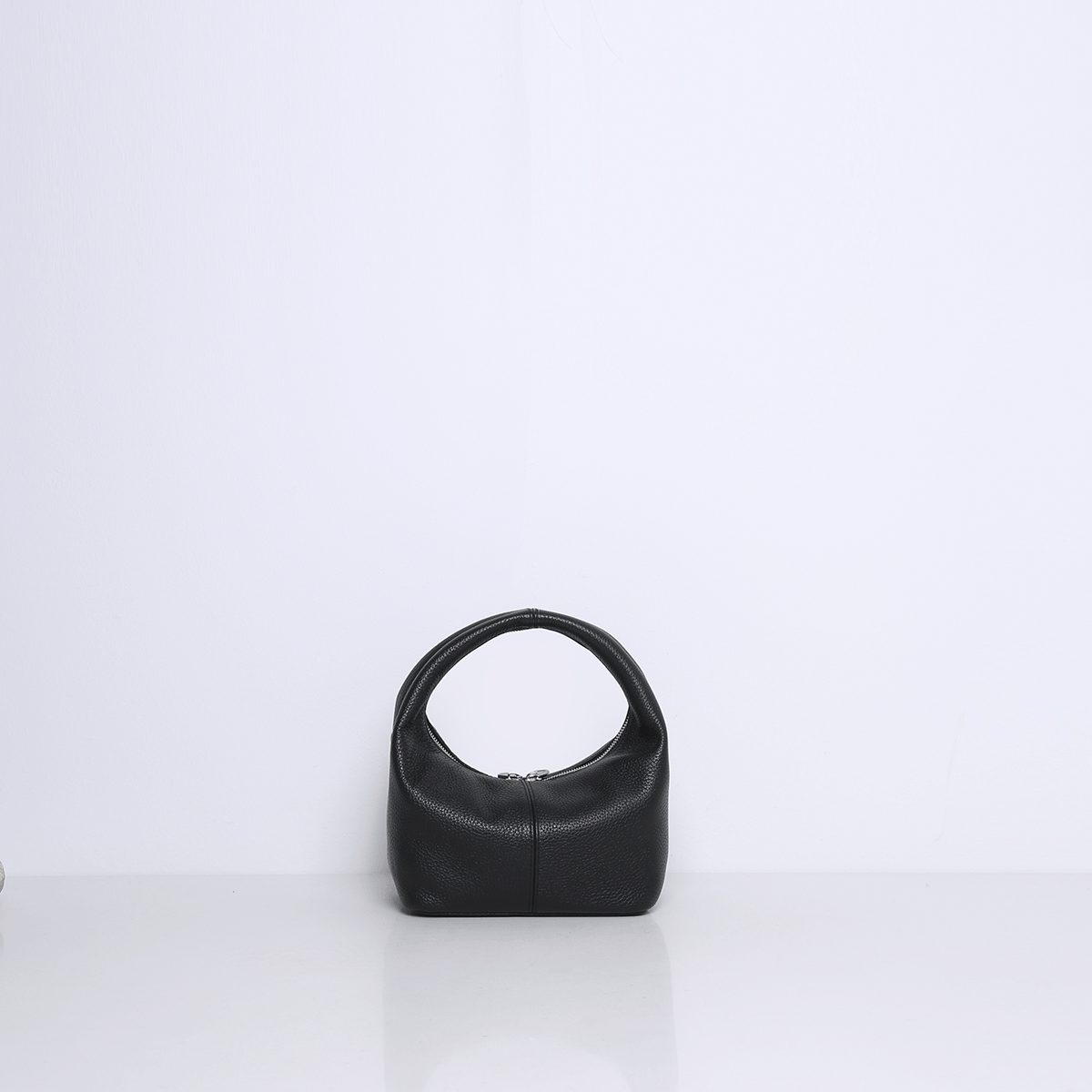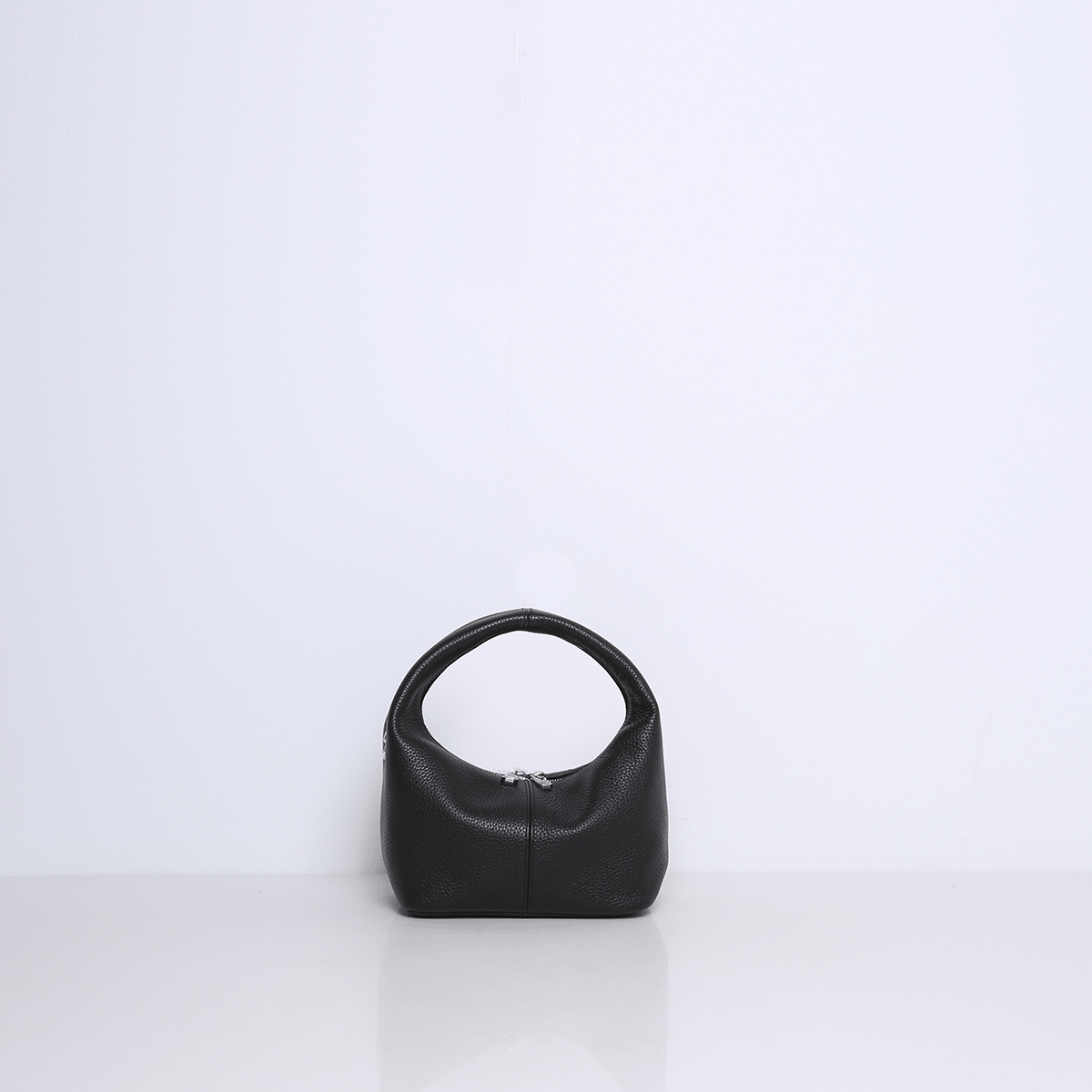 Die SHELBY ist eine kompakte Mini-Tragetasche mit einem unverwechselbaren Design. Die Tasche fällt durch ihre runde, halbrunde Form und den breiten Ledergriff auf. Das Leder fühlt sich geschmeidig und leicht an, sodass die Tasche bequem in der Hand liegt.