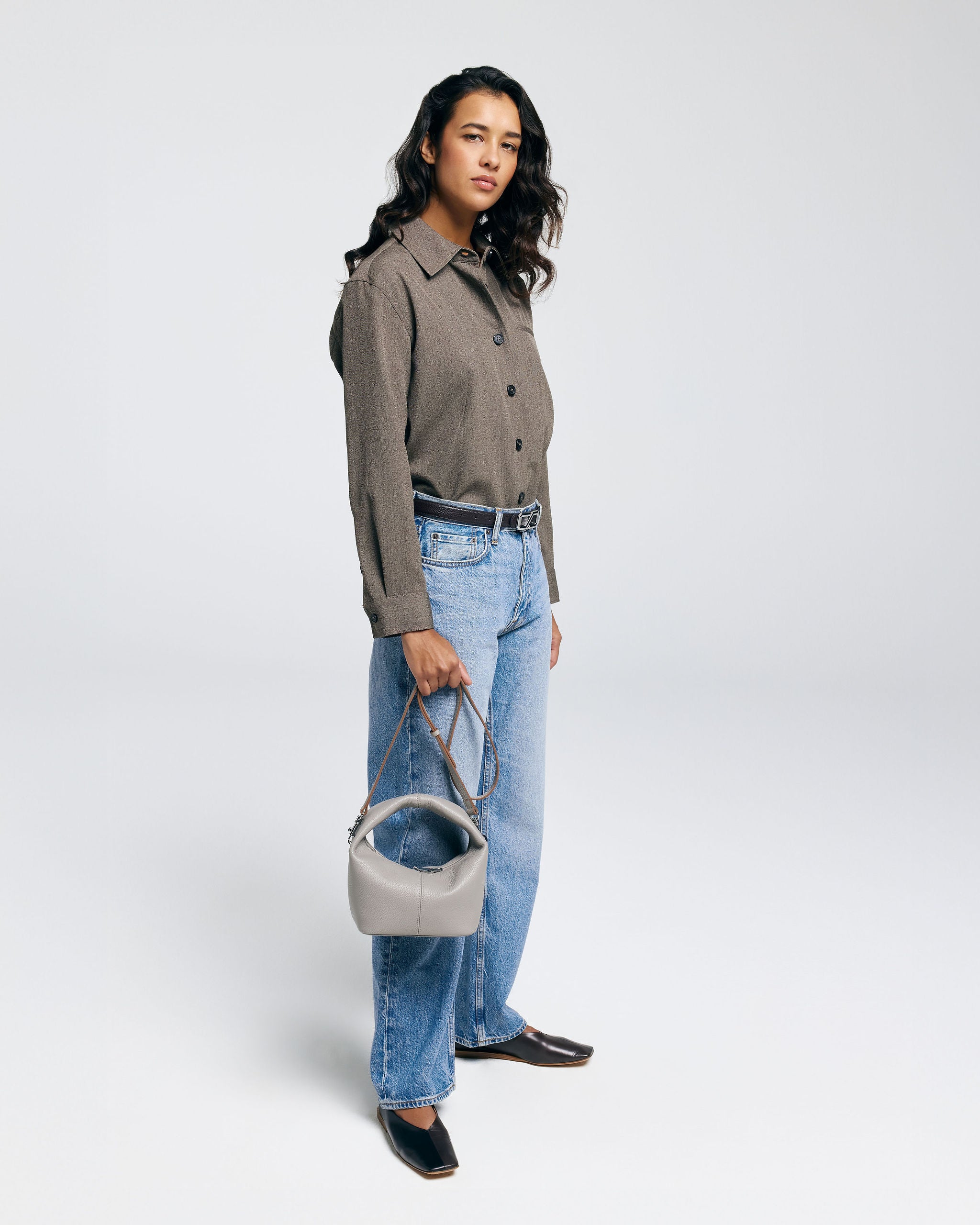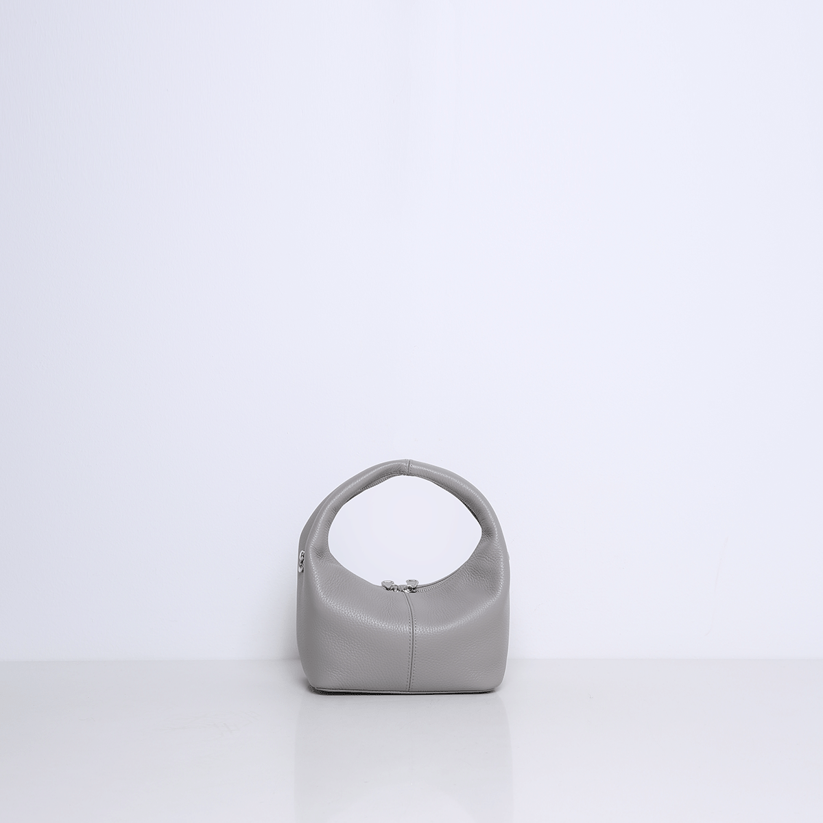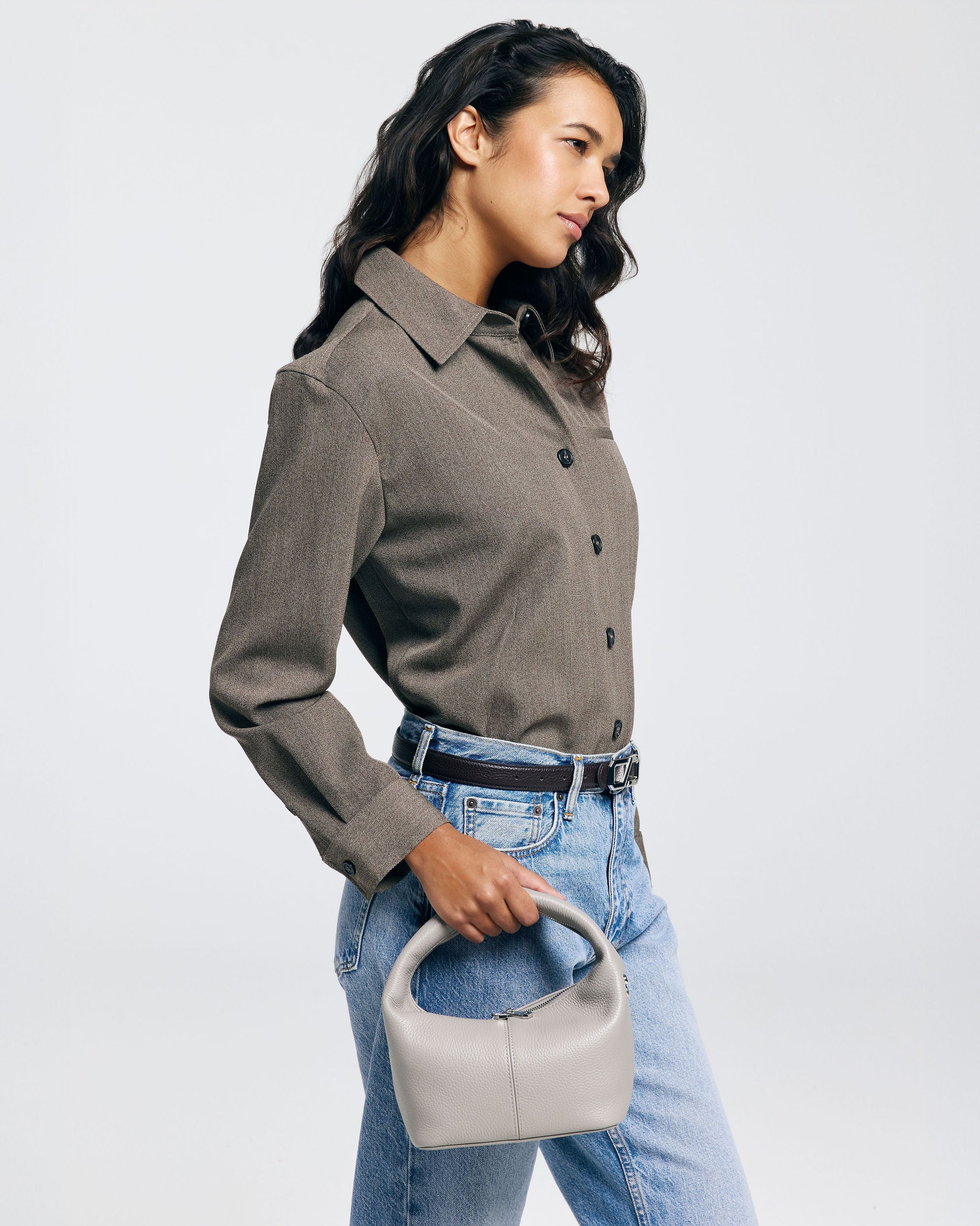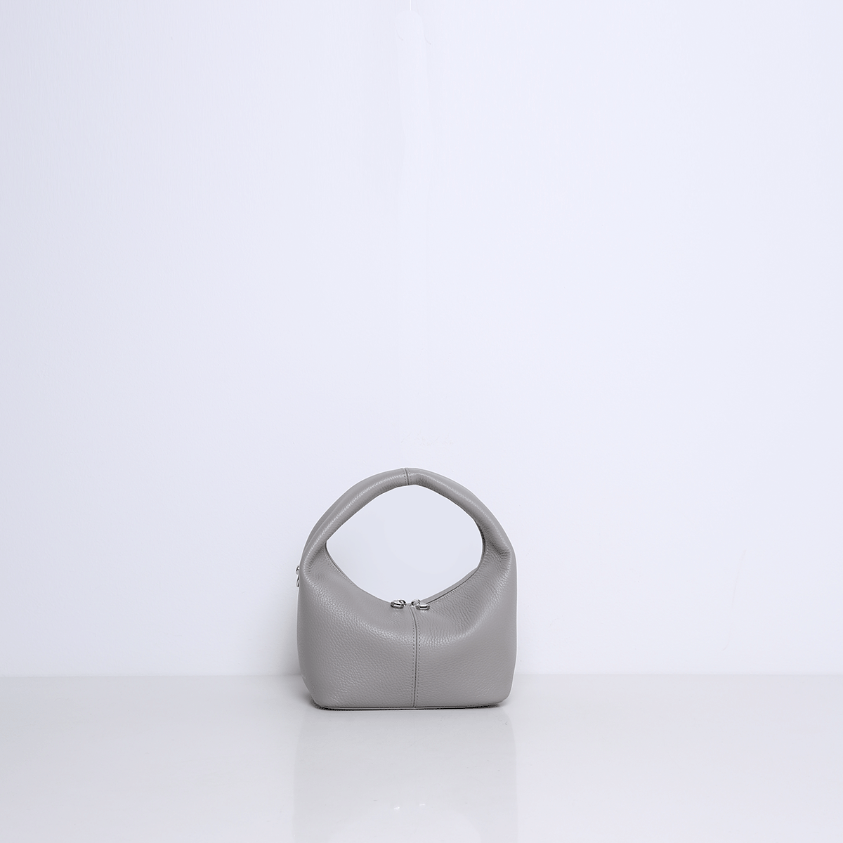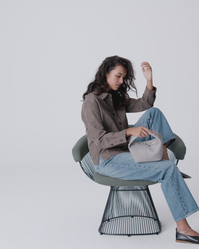 Die SHELBY ist eine kompakte Mini-Tragetasche mit einem unverwechselbaren Design. Die Tasche fällt durch ihre runde, halbrunde Form und den breiten Ledergriff auf. Das Leder fühlt sich geschmeidig und leicht an, sodass die Tasche bequem in der Hand liegt.