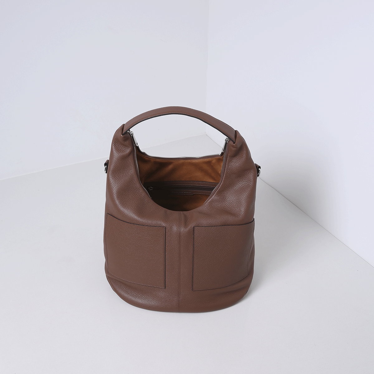 Eine geschmeidige Oboentasche mit einer geräumigen, weichen Silhouette, die sich schön um den Körper schmiegt. Die runde Form und die subtilen Linien verleihen der Tasche einen entspannten, aber eleganten Look. Dank des stabilen Bodens steht sie gut, während das Leder Ihren Bewegungen natürlich folgt.
